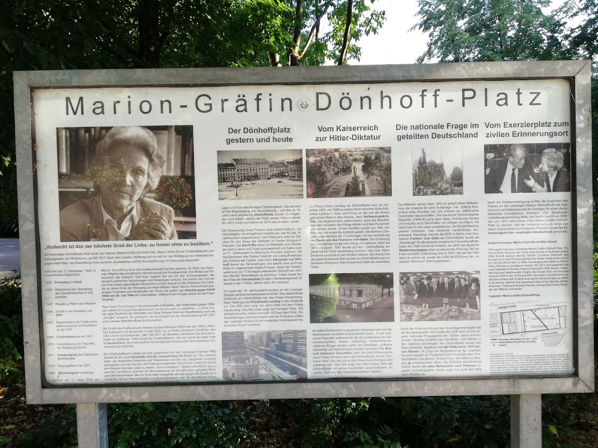 Marion-Grafin-Donhoff-Platz is a small public square situated along Leipziger strasse and Jerusalemer strasse in the Mitte District of Berlin. This is a quiet area with park benches as well as a semi-circle shaped colonnade structure and small obelisk facing Liepziger strasse which are both interesting to see.