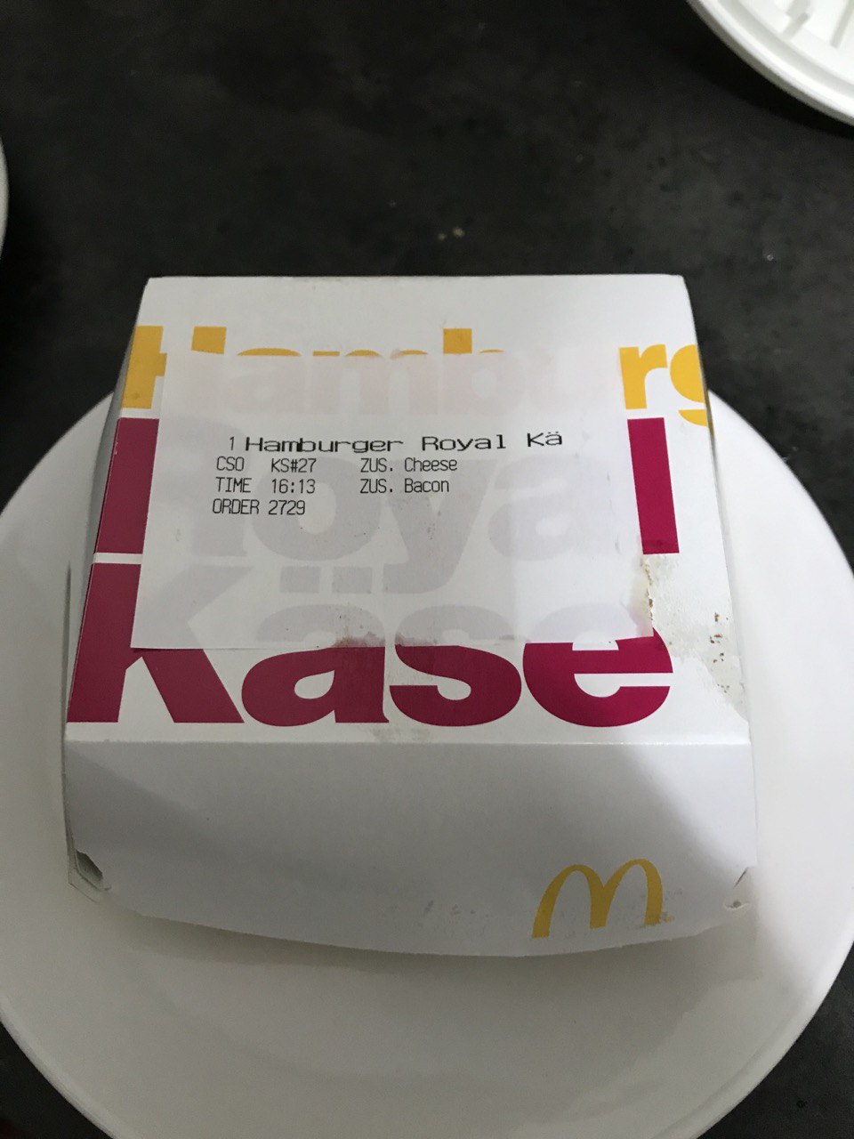 Here is my Hamburger Royal with additional cheese and bacon that costs 5eur. It was takeaway order so I found out it only at home. Also burger from Signature collection was superdry. Don't buy anything there.