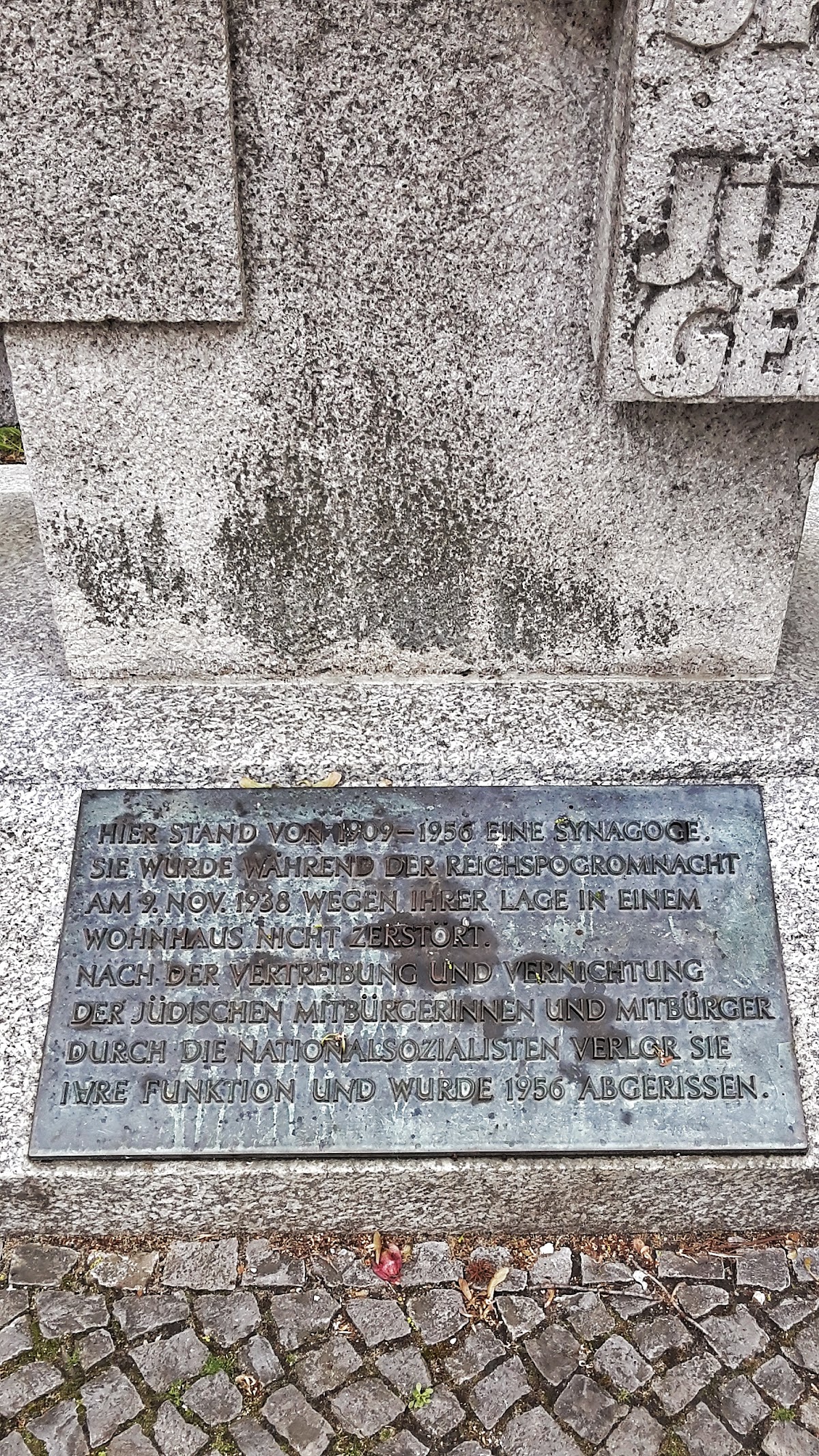(Translated by Google) The synagogue was inaugurated in 1910. The complex consisted of a residential building with school rooms and the actual synagogue in the courtyard. The buildings survived the Reichsprogomnacht relatively unscathed. While the house was destroyed in World War II, the synagogue was preserved. In 1956, however, it was blown up, which the plate at the foot of the monument describes more than insensitive with these words: