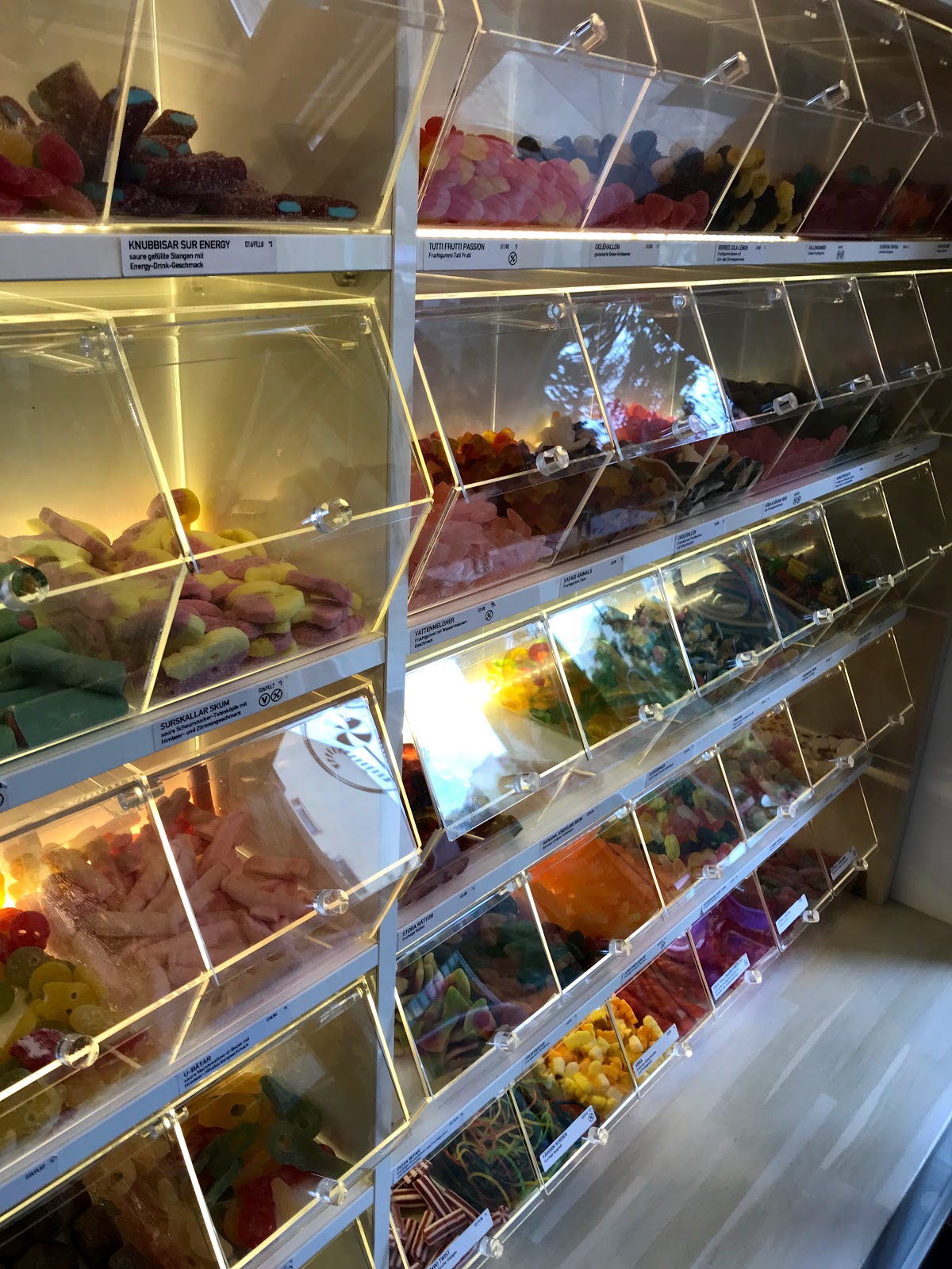 Mit viel Liebe ausgewählte Süßigkeiten aus Skandinavien und darüber hinaus, vor allem leckere, originelle Sachen, die man sonst nicht in Deutschland findet, darunter 30 verschiedene Sorten von Marabou-Schokolade, 150 verschiedene lose Fruchtgummie- und Schaumzucker-Teilchen aus der großen Schüttenwand mit zum Teil überraschenden Geschmacksrichtungen wie Wassermelone, Bubble Gum oder Punsch. Im Sommer gibt es das selbstgemachte vegane Eis am Stiel.