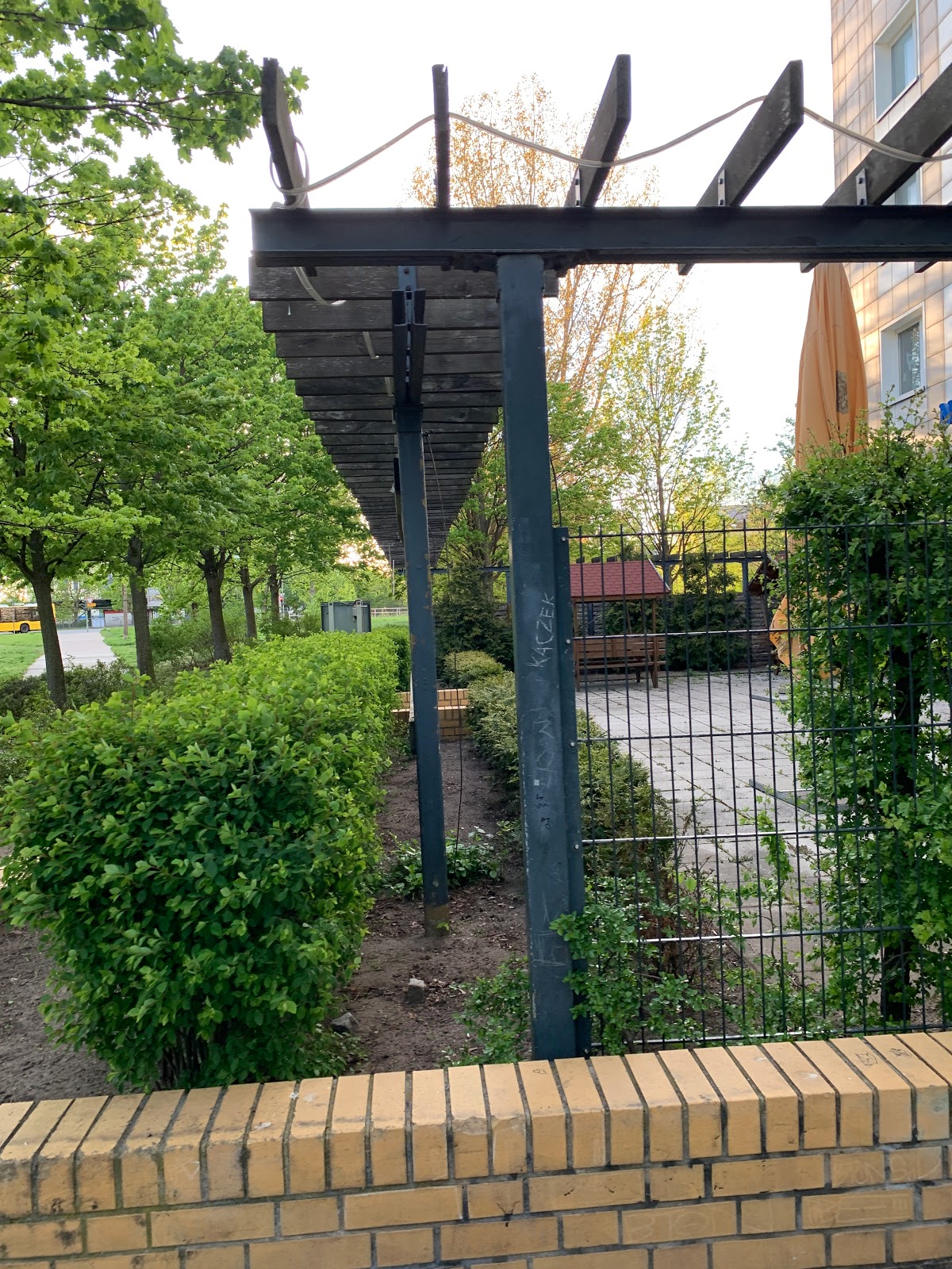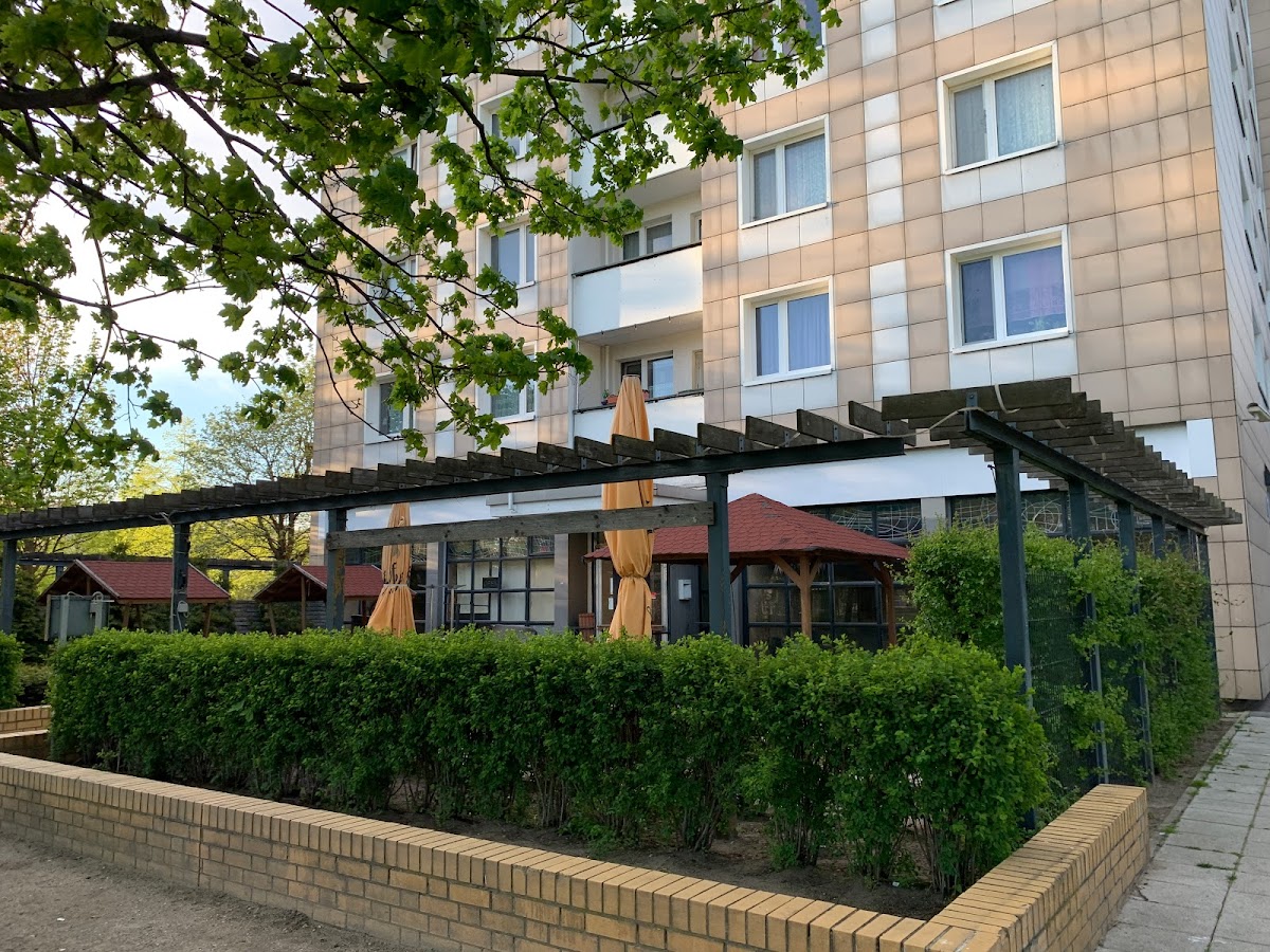 (Translated by Google) It looks a bit like an abandoned ... or maybe just not well-groomed for a long time ... located right "on the first floor" of a high-rise. There is an S-Bahn nearby (S7- Mehrower Allee). Buses run. And there is parking. The "fence" made of bushes is very nice.