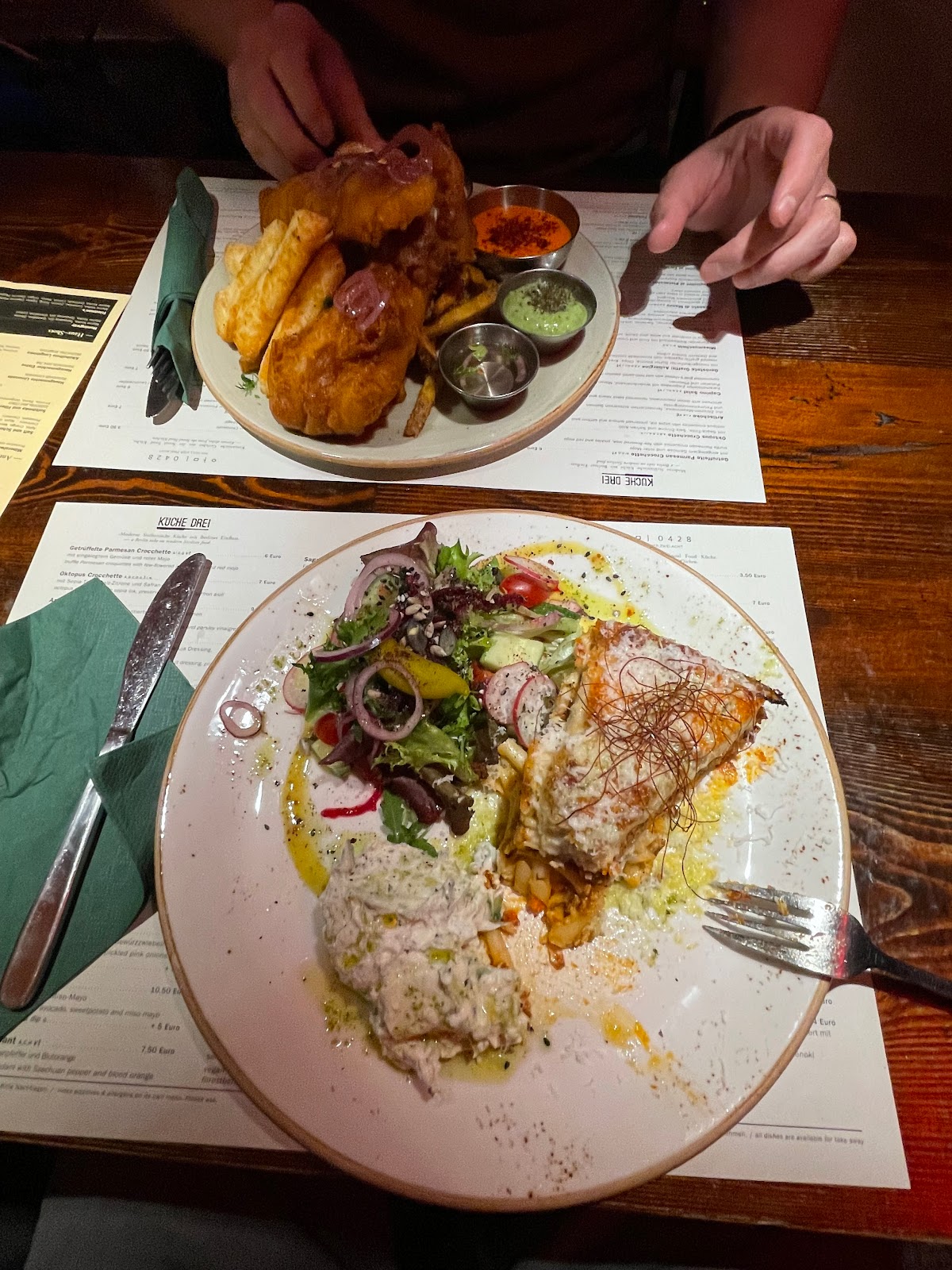 As you may have read in the description: this place is three kitchens combined. Every menu has some tapas-options, main dishes and desserts.