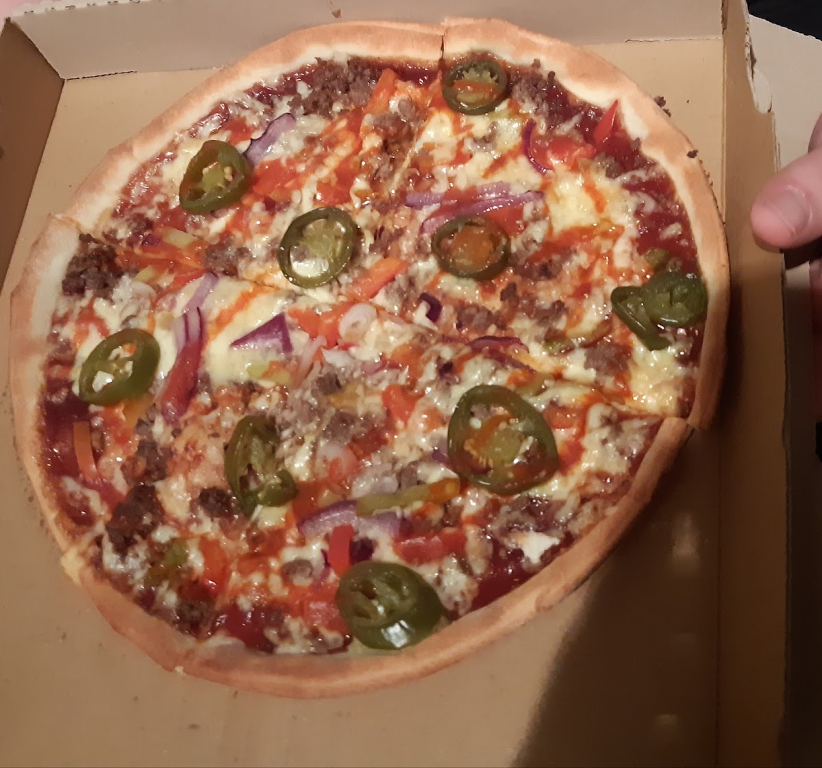 Wir hatten sonst keine Probleme, war immer alles ok. Ich wollte seid langem mal wieder Mozarella im rand, (2,30€ Aufpreis für eine 24cm Pizza). Lieferzeit (ca.60min.) War super, die Pizza allerdings war fettig, und siehe Bild, leider nicht so voll belegt. Vom bestellen Mozarella im rand für eine 24 cm Pizza ( über 10euro) war nichts zu sehn. Den sucht man vergebens. Und der Rand, erinnert eher an Leder. Als ich dann anrief und das problem schildern wollte, wurde man unhöflich und für doof hingestellt. Und er habe alles richtig gemacht.