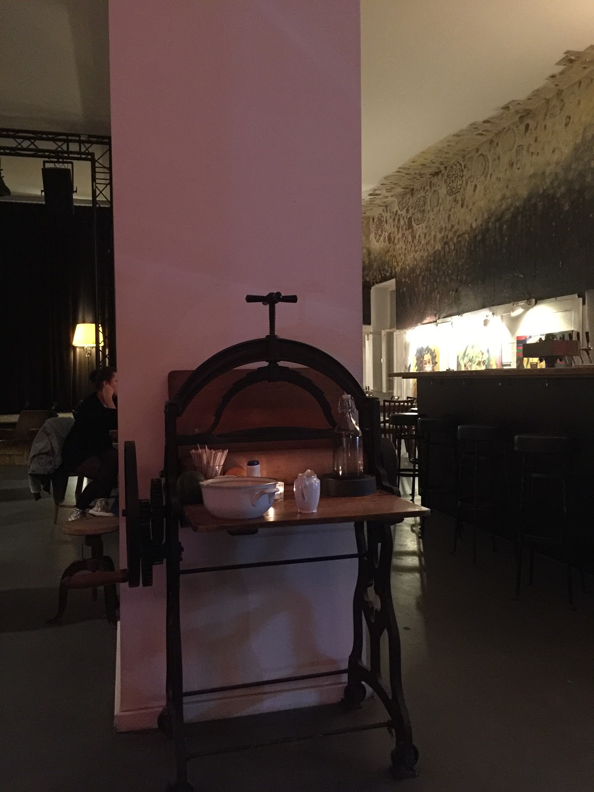 Nice place with an amazing high ceiling, full during covid but it's Berlin! Cool events. Only the bar was always slow despite that the bartender was smoking hot! But the drinks were as if your ordering from the spati or you loss the interest of drinking in a long cue. I didn't try the food but I saw a lot of cheese cake around! Either it's good or the only thing to hold your stomach.