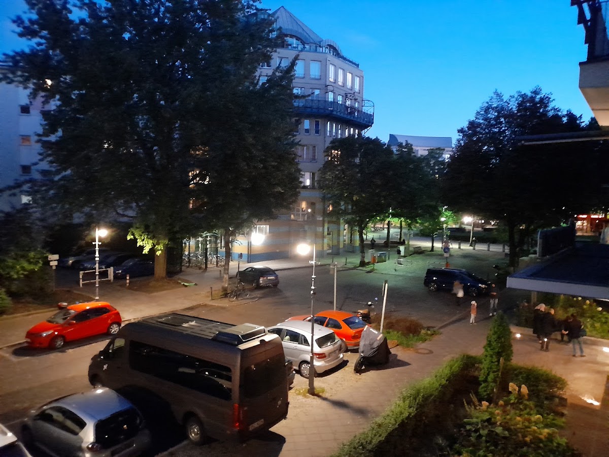 It has several stores including Edeka, Aldi, DM, Apotheke, Gym and multiple restaurants. So you can kind of get every thing at a single place. Just outside, there is a small park with a fountain where you can relax.