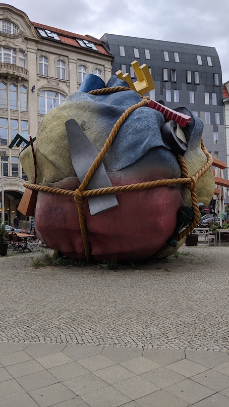 Created by Claes Oldenburg and Coosje van Bruggen in 1997, this is a 11 meter tall Pop Art style installation. Its shape and form is that of roundish bundle that includes household items and is held together with rope. It is a provocative artwork with colours that help it stick out against the buildings in all directions.