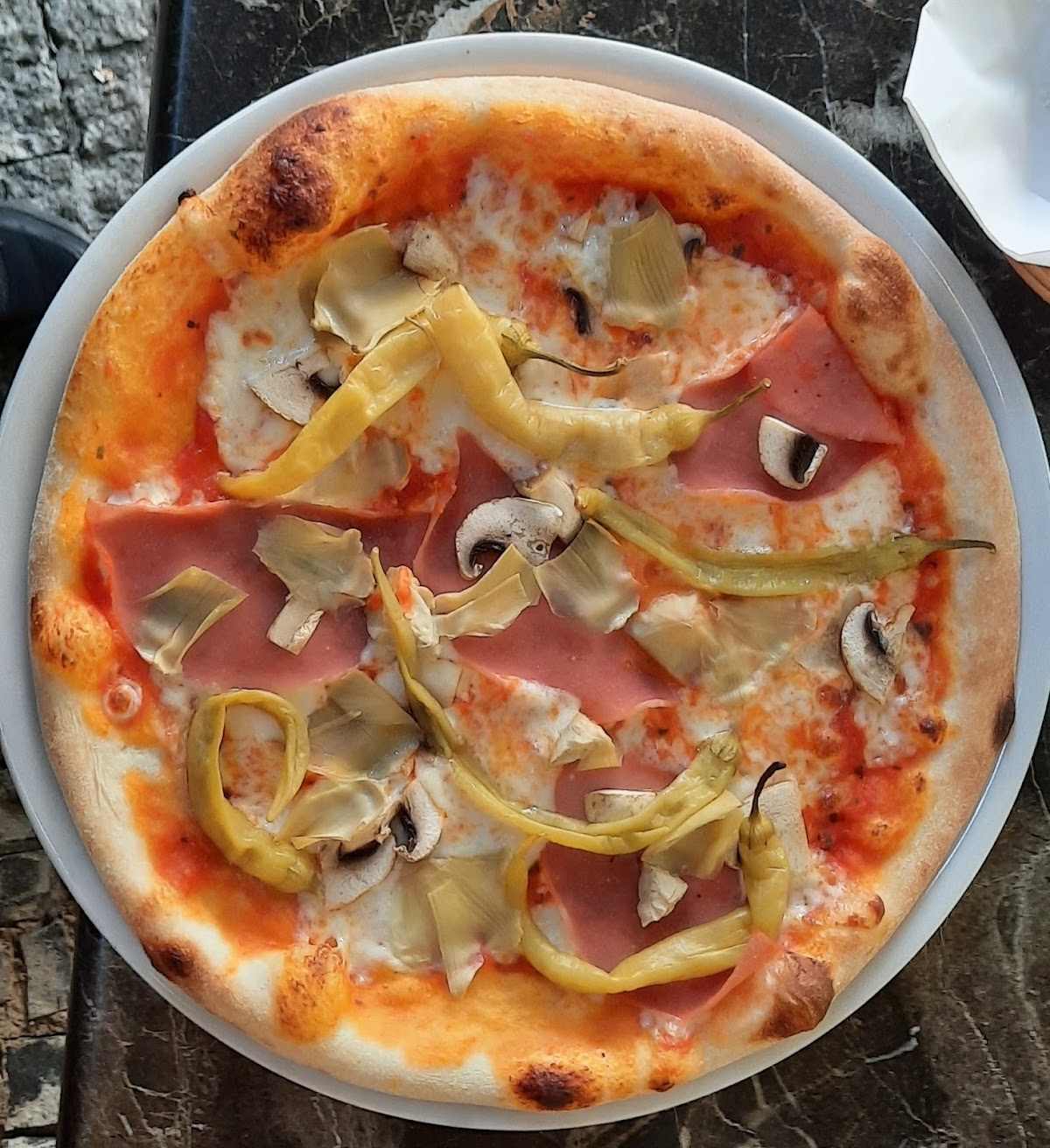 The prices are actually too low for the great taste and the size of the pizza (you can guess a plate under the pizza), but well adapted to the area. Food can also be ordered, but must be picked up.