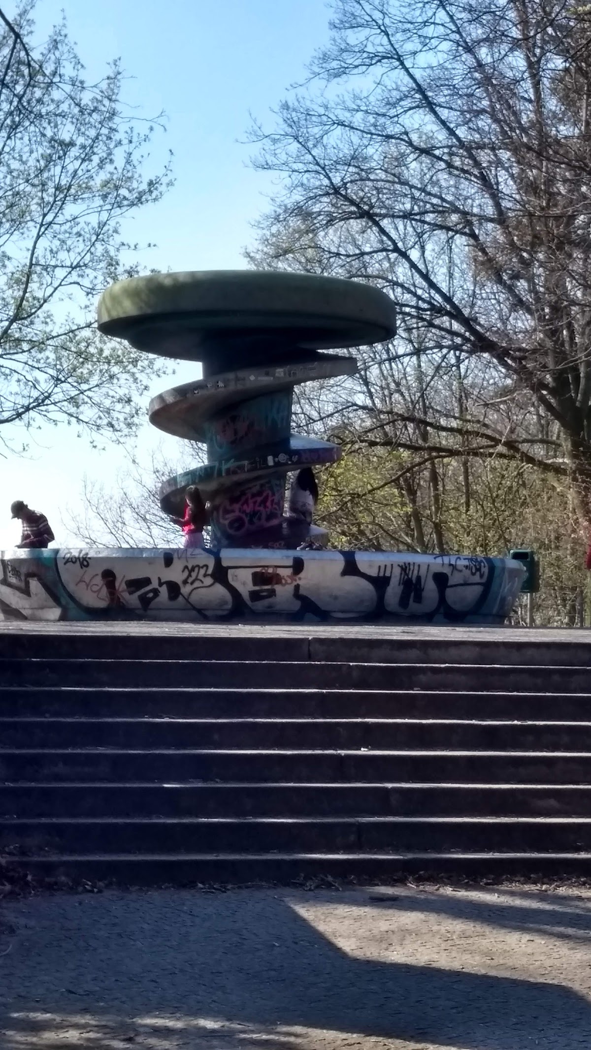 Massiver Brunnen aus Bronze von Georg Kolbe, von den Nazis zersägt und eingeschmolzen, dann Jahrzehnte später neu errichtet. Jetzt beschmiert und ohne Wasser. Immer noch sehr beeindruckend am Ende einer Allee auf einer Erhebung.