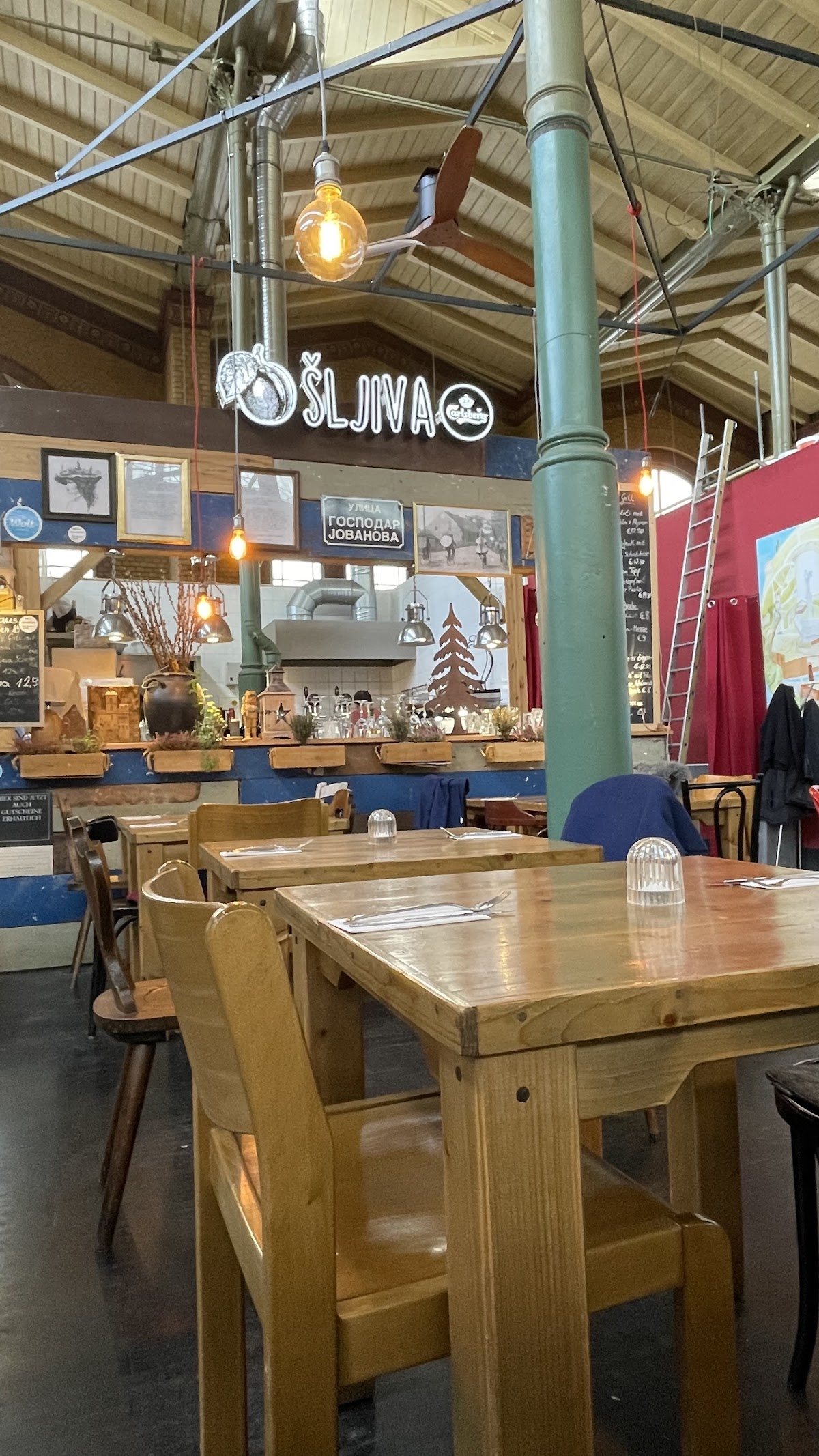 Perfect. Absolutely stunning. My parents and I went out for dinner and found ourselves in Arminiusmarkthalle in Moabit, which we really love. My dad saw Šljiva and said he’s been craving Balkan food for a while. So we went. It was a Monday afternoon (opens at 18:00) so it was quite empty. The restaurant is very cute with pretty wooden tables and Serbian memorabilia. We ordered plums stuffed with cheese and wrapped in bacon (epic), classic sopska salad (very good) and proja, which is Serbian take on corn bread, served with spinach and cheese (also very good). Then came the mains. Ćevapčići (skinless sausages served with ajvar, grilled capsicum paste and kajmak, the love child of cream and butter) and the grilled octopus. I have never had such delicious octopus. It was crispy on the outside and melting on the inside. All of that with delicious fried potatoes smothered in garlic. It was an amazing feast. Everything was delicious. All prepared with love by a lovely lady, who also served us. Thank you so much for this! We had a blast. Will definitely go back.
