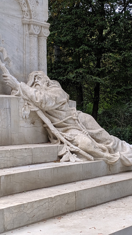 The monument is a marble statue featuring a seated Richard Wagner surrounded by visual leitmotifs of his most famous operas including Tannhäuser and The Ring Cycle. Wagner is depicted with his left hand resting on the chair, while his right fist is clenched above a bunch of sheet music, alluding to his legendary perfectionism. The base is surrounded by characters from Wagner's aforementioned works. Much like his music, the sculptures are exceptional for it's complex textures, especially on Brunhild mourning over Siegfried and Alberich protecting the Nibelungen treasure, while one of the daughters of the Rhine is teasing Alberich's beard.
