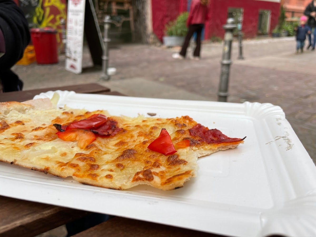If you are a fan of thin, crispy pizza, this is your place. A great stop in the city for big or small hunger with adventurous or less adventurous flavours of your choice. Great extra topping options and excellent dips, such as the spicy maple syrup. I picked up a potato/sweet/rosemary slice and a pesto/olive/sun dried tomato slice. I took the slices to go and was happy for the recommendation of spicy maple syrup dip. Both pizzas were delicious and the bill wasn’t too dear either for too big slices (~7e). Highly recommended.