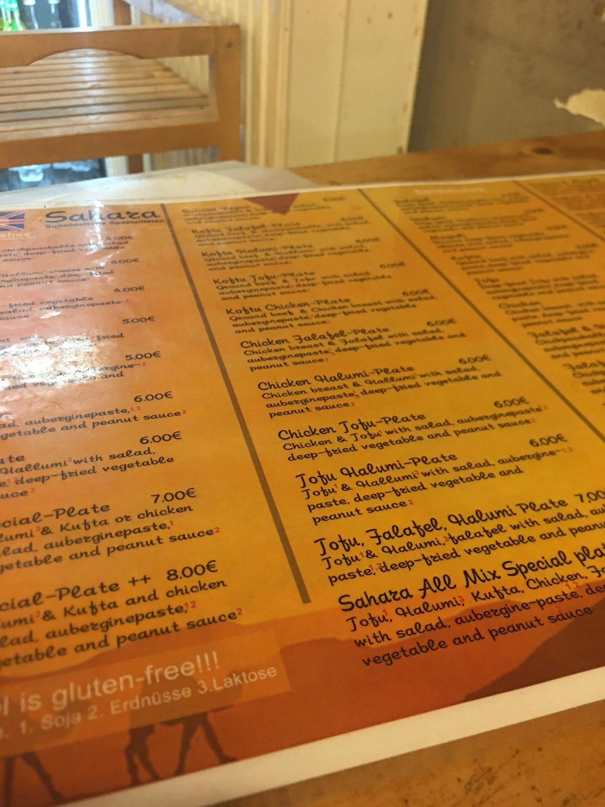 Nom-nom-iness 120/100! A bowl full of falafel balls, sweet potato, and salad, topped with peanut sauce. A friend of mine recommended this as one of the "vegan must eats" in Berlin and she wasn't wrong. Outstanding value for money. The joint's pretty small, so be prepared to wait or take away. Highly recommended for vegans and vegetarians.