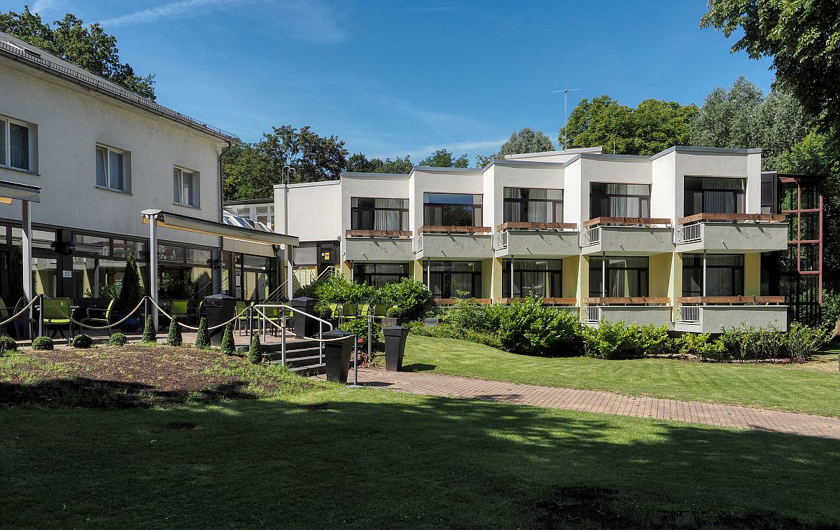 We stayed in a family room, so double bed and single bed, there was even a sofa bed for two more people. The room was spacious, and once we opened the windows it was more comfy. But very still and warm in June! Fans would be helpful. The bathroom was tiny, with a very small shower tray. We arrived around 345Pm, and the bikes for hire were already locked up. But we walked nearby to a small silty beach and swam. There are paddle boats available from the hotel, which are free, and that was lovely. We asked in advance about dinner, and they luckily gave us a voucher, otherwise the dinner buffet was sold out later. The buffet is cold, with a soup. Cold pasta, cold cuts, a simple berry compote. The only a la carte food was a fresh flan, which was delicious and light. The hotel restaurant has a lovely terrace overlooking the lake, where the bar is open till 11 pm. Breakfast was continental style, with scrambled eggs, bread rolls, fruit, cereals, cheese. We rented a bike the next morning, after checking out at ten am, and swam. A lovely night out away from Berlin, the Grunewald forest is beautiful, with walks, biking, swimming. Great for families.