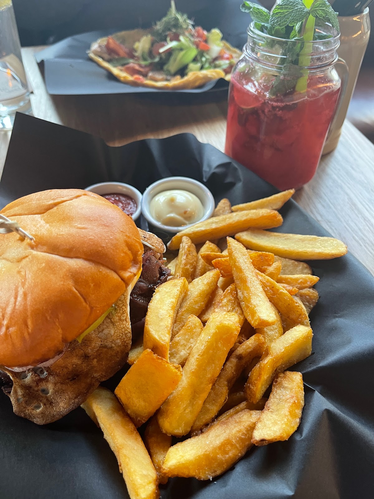 Even though it's more of a cookie cut place than a local cultural experience it is a very good place to eat a bite and have a chat with friends. The place is well ventilated, well lit, has comfortable sitting and is big enough to not have sounds mix up with one another into a cacophony of conversations and cutlery clinging noise. The menu is "Americanized" but the food is good. If you don't want surprises and would like a tasty burger or a vegetarian option this place won't disappoint.
