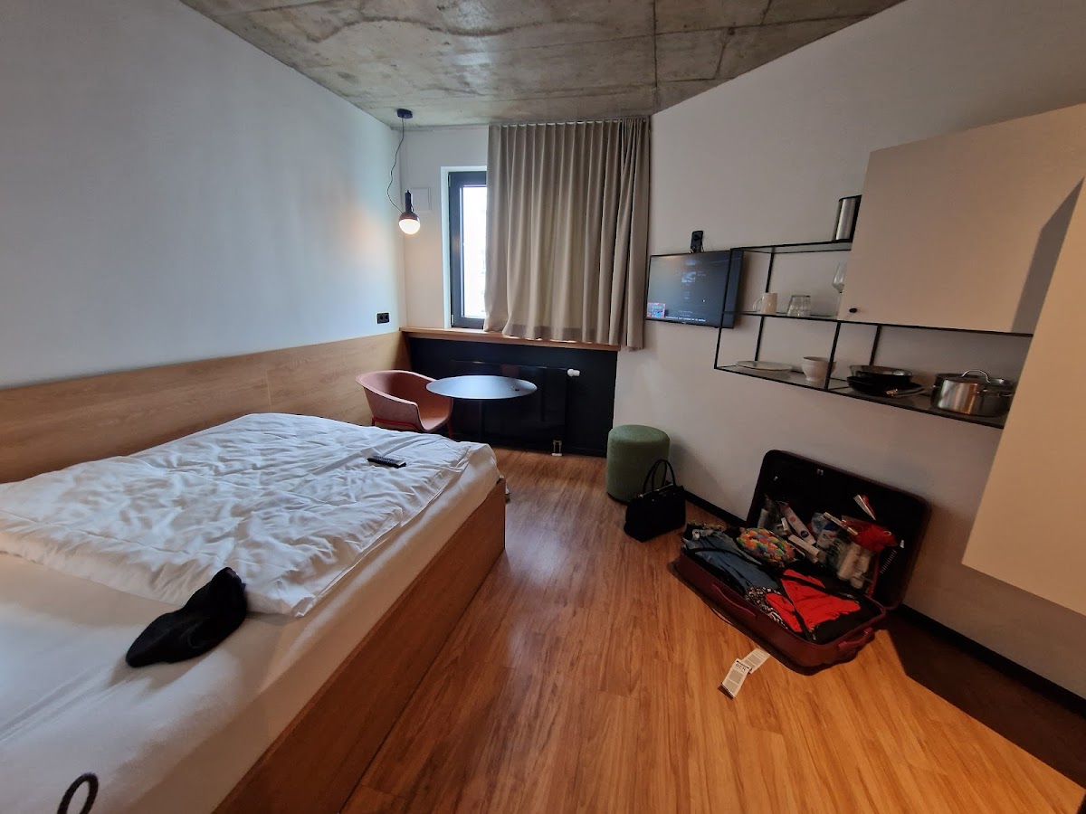 The room was modern, spacious and extremely clean. The room comes equipped with utensils for 2 peoples, a fridge, hob, microwave and toaster.