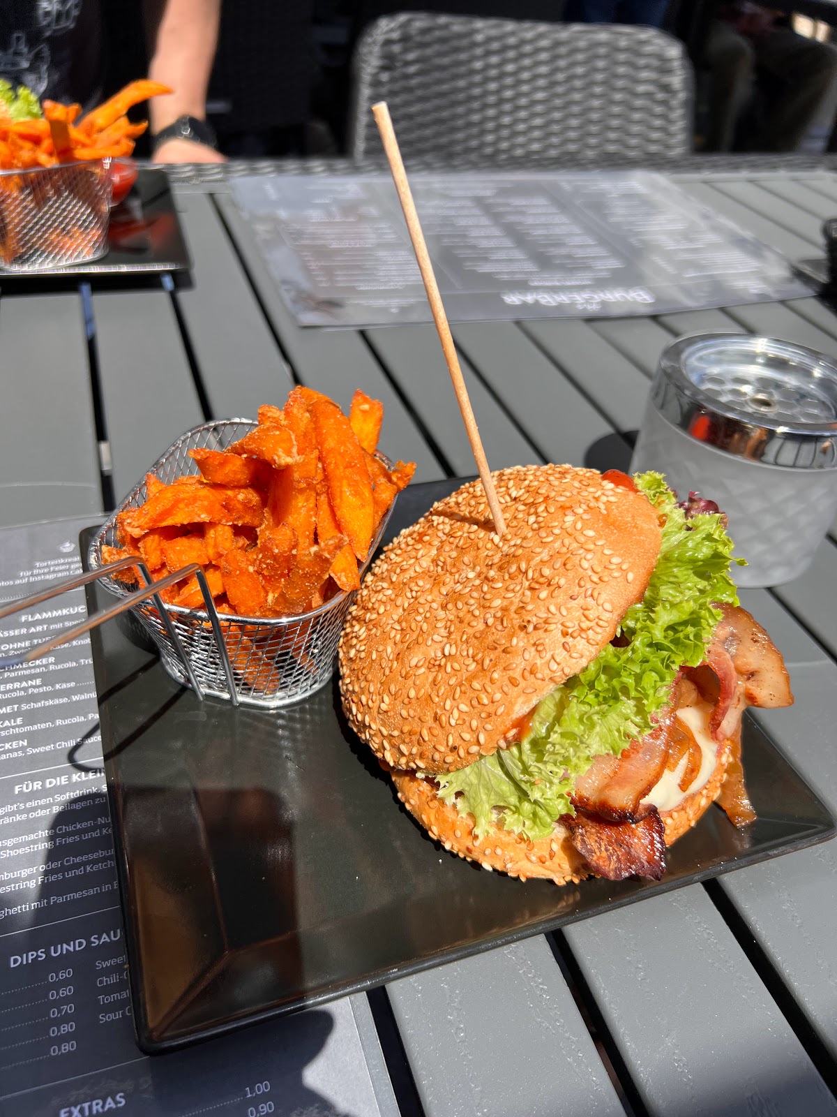 Delicious Burger, best sweet potato fries!! 10/10 would Recommend