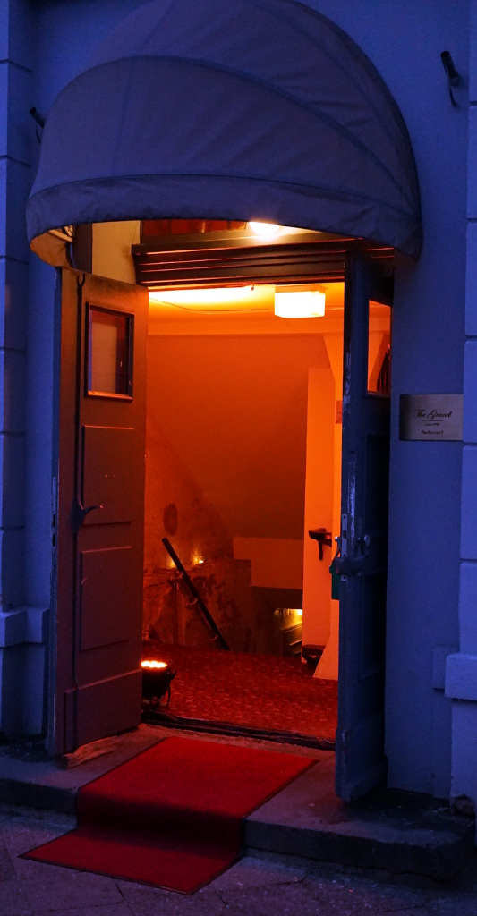 From the outside, the building of The Grand shows rather restrained, only the two entrances, one to the restaurant, the other to the bar. This may be due to the historical preservation of the school building from 1842 or just understatement - in any case this is more appealing than a brewery sponsored neon sign - Subtle lighting accents on the left entrance and a gold sign told us that we had found The Grand.