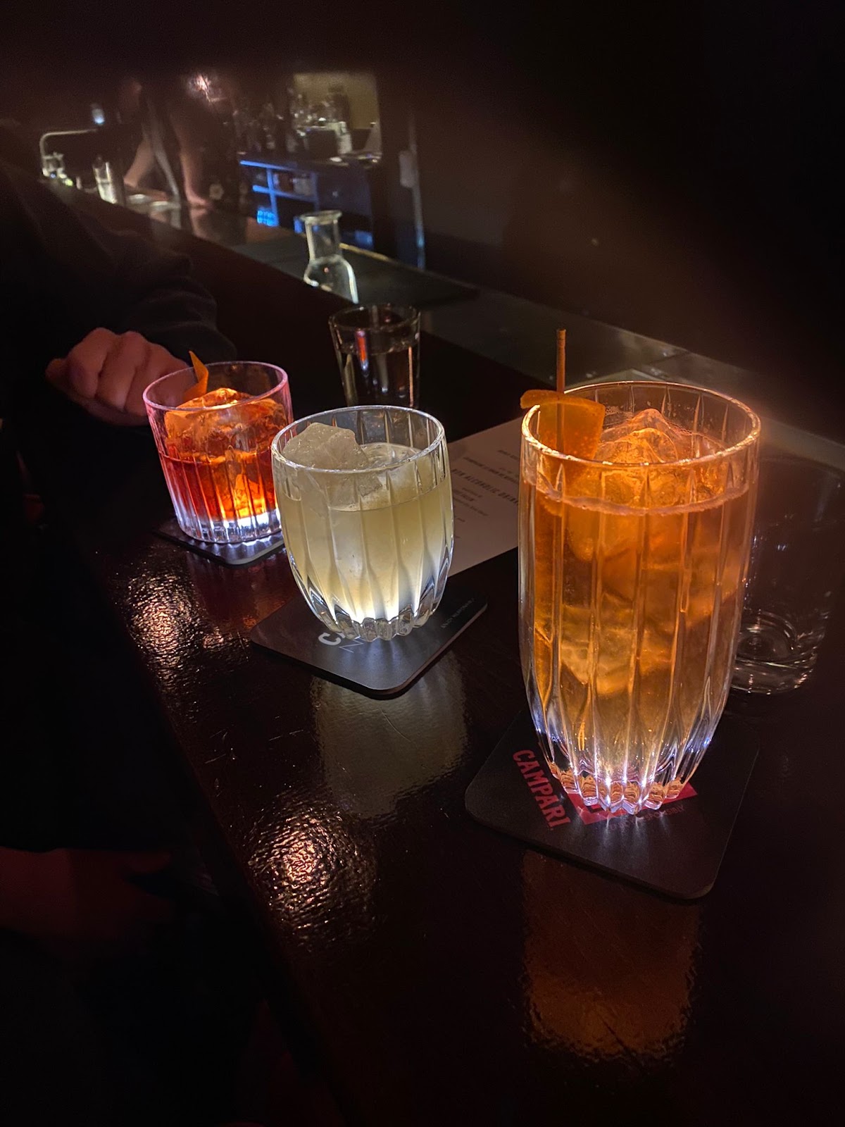 i tasted blood spending a lot of money on fancy drinks recently and really wanted to continue. this bar served my desire, each alcoholic cocktail costs 11€. it's more than the current minimum wage per hour in germany, but you can make a cheers to the new coalition agreement setting it at least a little higher to 12€ hopefully soon. there is only a handful of options on the menu - great not to be overwhelmed by choices though (i'm a pisces rising !). we had the whiskey sour, horse's neck, the last wall, a riesling and i ordered a negroni that put hair on my chest. it came with a cool ice cube and a funky coaster that lights up your glass. little tip: ask for them if you don't get one, they will surely de~light your evening !