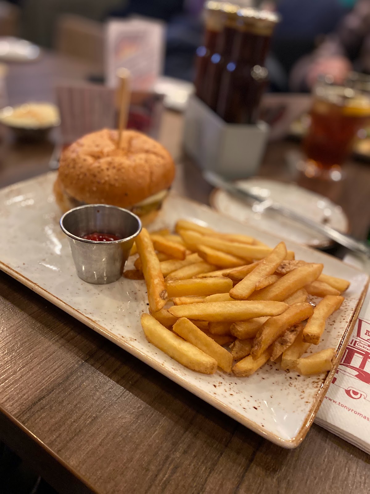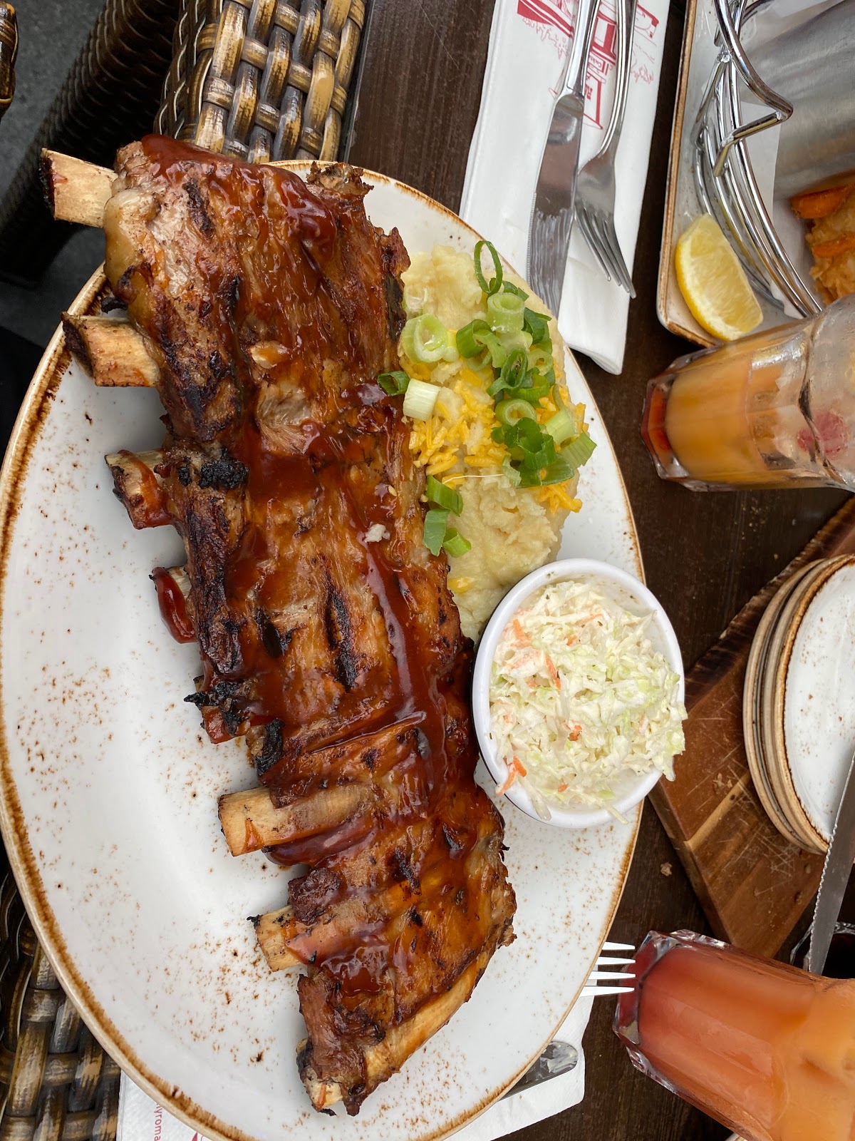 The food portion are really American, because there super big. My ribs were kinda dry. The fish and chips were delicious according to my friend and the chicken was also good. I personally really liked the honey barbecue sauce. I was a bit disappointed about the cocktails, there pricey but nothing special. The stuff is efficient and fast. We wanted to order a second round of drinks and our waiter forgot us. But over all, there nice and give there best. You can pay via card. You can make a reservation but you don’t have to. This restaurant is a good choice if one of your friends really wants a American dinning experience, otherwise I would say at the Mercedes Benz Platz you can simple choose something more relaxed. You can sit in the outside Area or in the restaurant wich is nice.