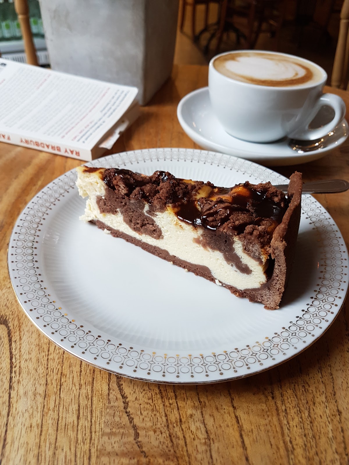 The location faced green park area. We've been there at 11 o'clock in the morning, so its a lot of suns outside. The cafe house offers self-service, takes orders inside and accept payments only in cash. There are no weight or quantity details in the menu. So I was a little bit disappointed with a small cappuccino cup and tiny cake. The cake was tasty, the latte macchiato lukewarm.