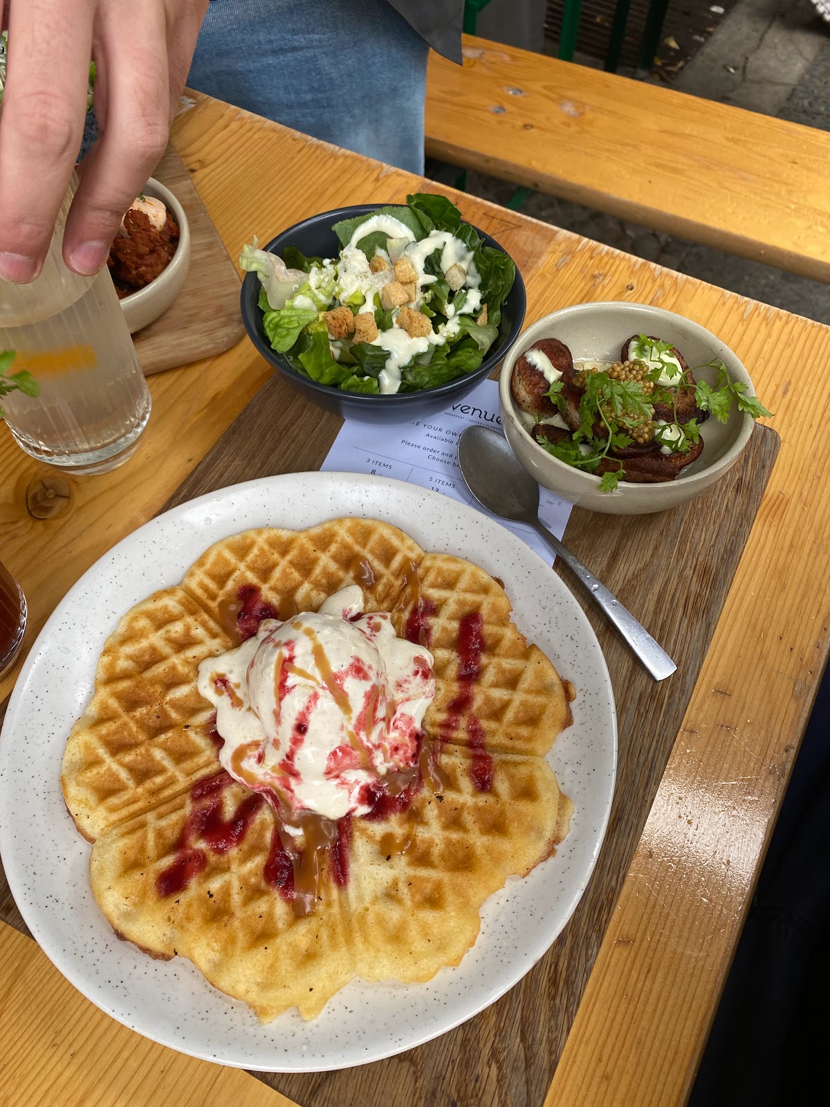 Venue is my favorite Brunch place in Berlin! I go here every few weeks. Can really recommend: the zucchini balls w tzatziki or its equivalent in winters, the hummus, the beetroot w feta and the waffle ????