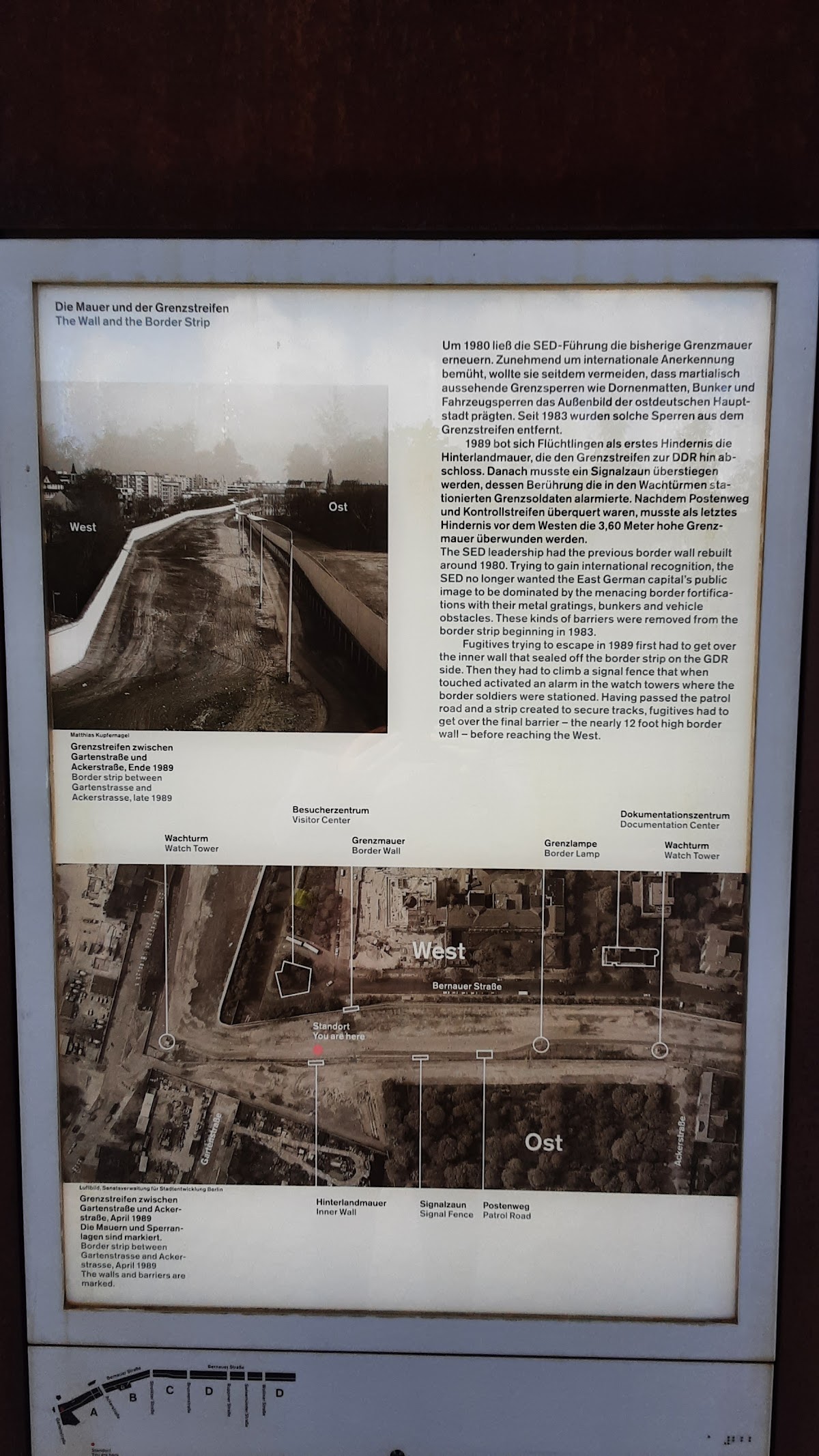 Great visitor center with a video explaining the construction and design of the Berlin Wall. It then had a second video explaining the impact on life to the east Berliners. The videos are played in both English and German. The videos are then subtitled in the other language. Plus, it's free.