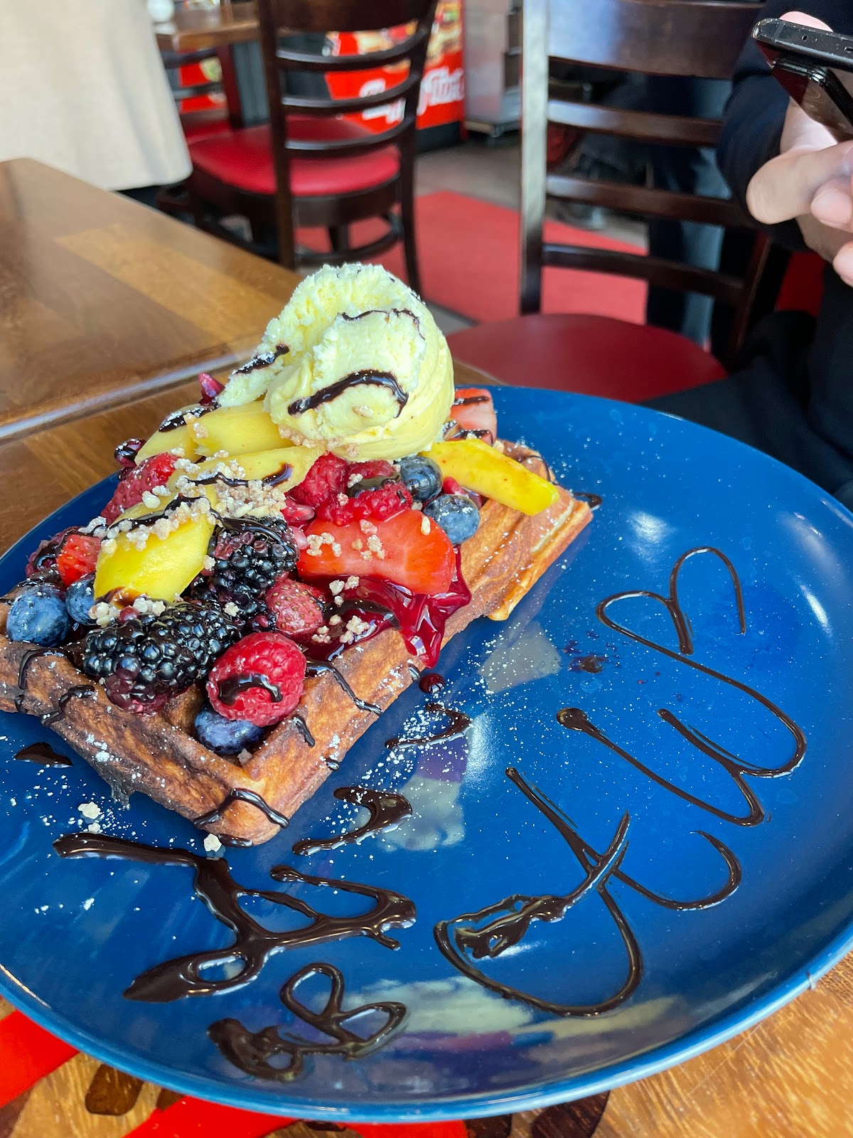 Fabulous waffles. They prepare them by sandwiching fruits, nuts and cookies of your choice and top it of with whipped cream and ice cream. They put the final touch by inscribing your name on the plate. Sweet!