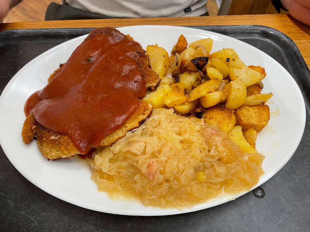 The schnitzel with fried potatoes and the cabbage rolls taste very good. Small extra requests are also taken into account.