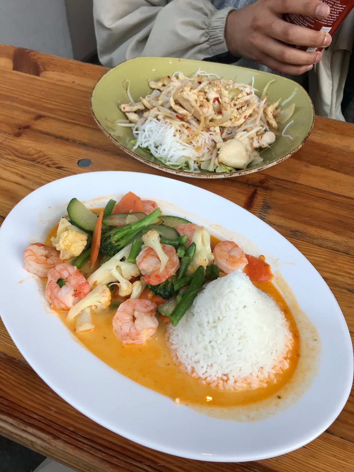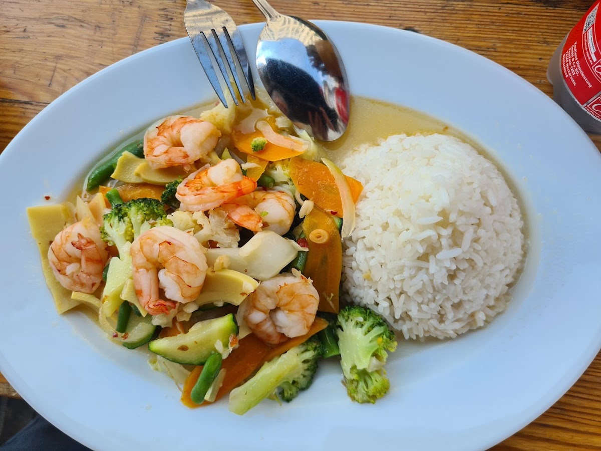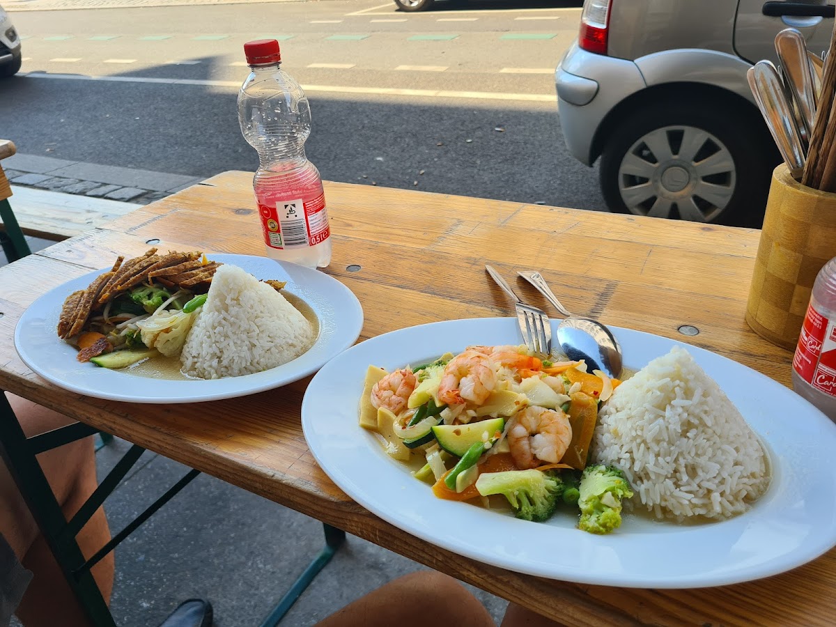 We had a late lunch on a Sunday, seated outside. The restaurant is small and didn't pay much attention to the decor inside as it was a warm summer day. The have tables with benches layout outdoor, if it get busy can be cozy. We ordered rice with vegetables one dish with duck and the other with shrimp. Both were good, the duck was a bit more generous. The food arrive in good time, the portions are reasonable, but if you are very hungry order an apetizer too.
