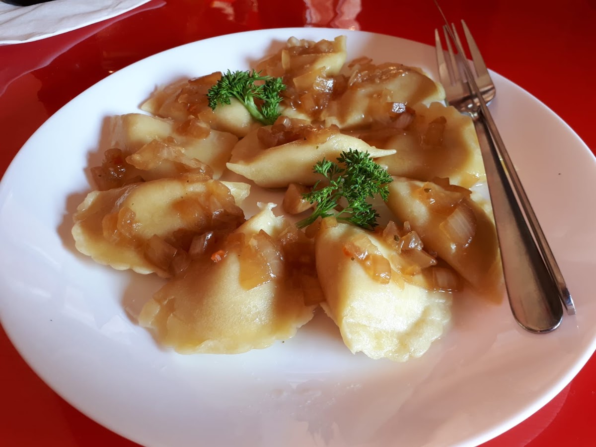 The sauerkraut - champignon pirogies taste amazing and they're vegan. Also good price.