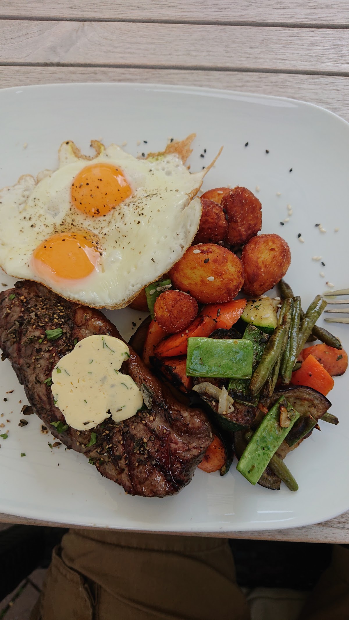 Ich hatte das Filetsteak (englisch) und meine Begleitung das Ripeye (medium). Beides war auf den Punkt! Die Fleischqualität ist wirklich super. Dazu kann man verschiedene Beilagen wählen (diese sind inklusive). Kräuterbrot und einen recht großen Beilagensalat gibt es auch immer dabei sowie verschiedene Saucen und Dips.