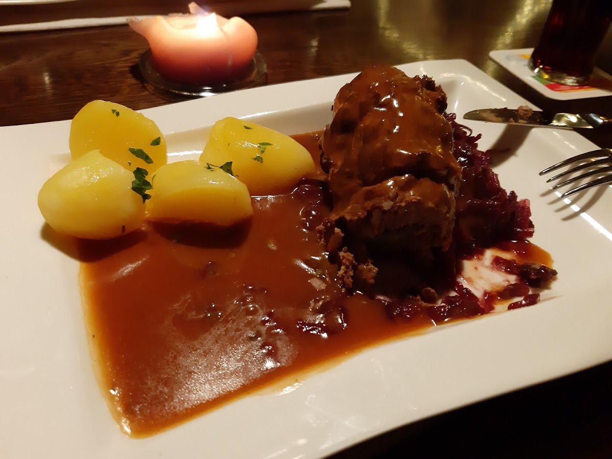 We had the roulades with potatoes and red cabbage and the homemade ice cream. What can I say it was EVERYTHING perfect. The potatoes were cooked to the point, the sauce was great, the red cabbage was definitely homemade and the roulade was tender and decayed. It doesn't get any better. The homemade ice cream was excellent and the service was absolutely friendly and courteous despite the fact that there was a lot going on. Everything was arranged very lovingly.