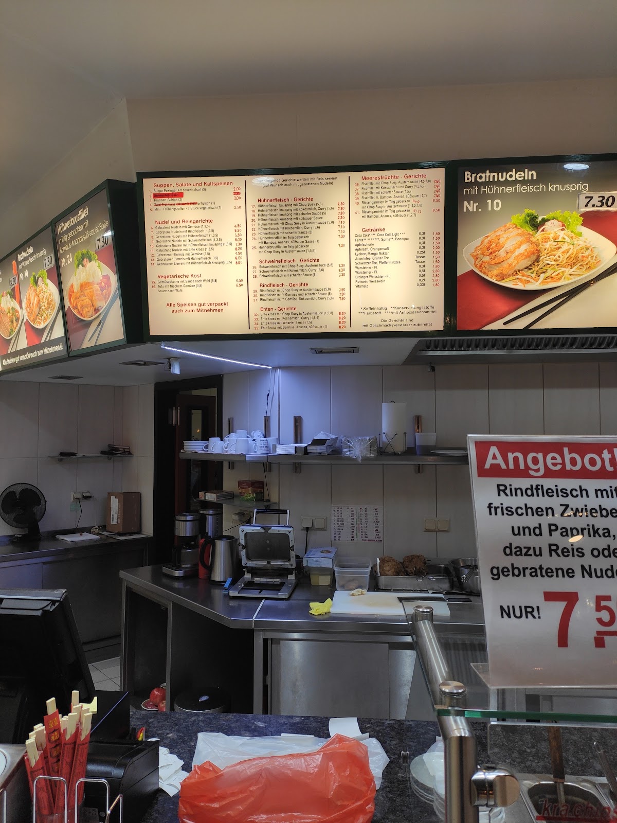 Reinfall.....Hatte gestern nur mal so nach dem Einkauf Nudeln mit Gemüse zum mitnehmen bestellt. Kosteten normal 5 Euro, aber es gab ein Schild und das besagte, alle Speisen 1 Euro Aufschlag wegen erhöhten Lieferpreisen der Nahrungsmittel. Nun halt sechs Euro. Soweit OK.....aber Zuhause angekommen musste ich feststellen, daß praktisch kein Gemüse in den Nudeln war. Nur ein paar wenige Möhrenstifte, die man aber tatsächlich suchen musste. Keine Sojasprosse oder dergleichen. Der Geschmack war leider auch fad und erinnerte keineswegs an einen Chinesen. Die Portionsgröße war mehr als ausreichend, aber es kam beim Essen kaum Freude auf. Leider nicht noch einmal......