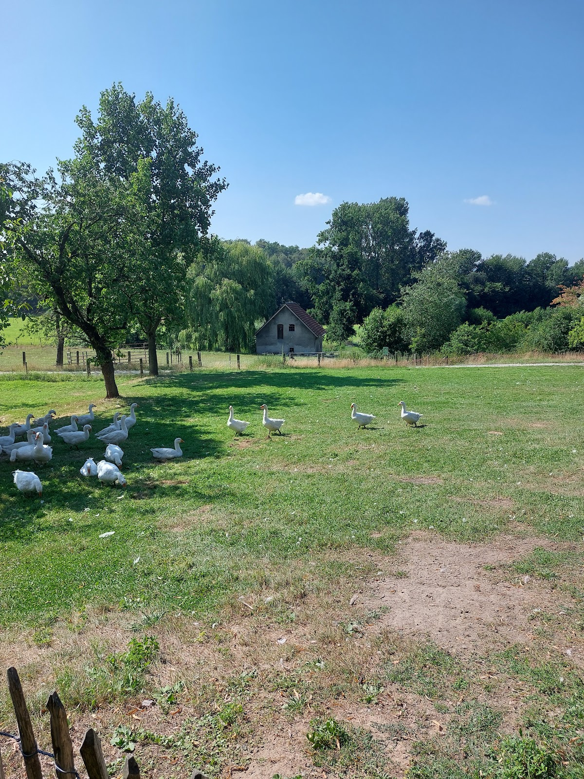 Hübsches Bauerncafe, welches auch Frühstücksbuffet anbietet. Es war in Ordnung, die Auswahl nicht riesig. Woanders wird einem mehr geboten. Mit dem Nachlegen der Speisen kam man nicht schnell genug hinterher. Dafür sind die Torten sehr gut und das Ambiente draußen wunderbar. Hier kann man auch gut mit kleinen Kindern hingehen. Wippe und Rutsche vorhanden. Gänse und Hähne ebenso.