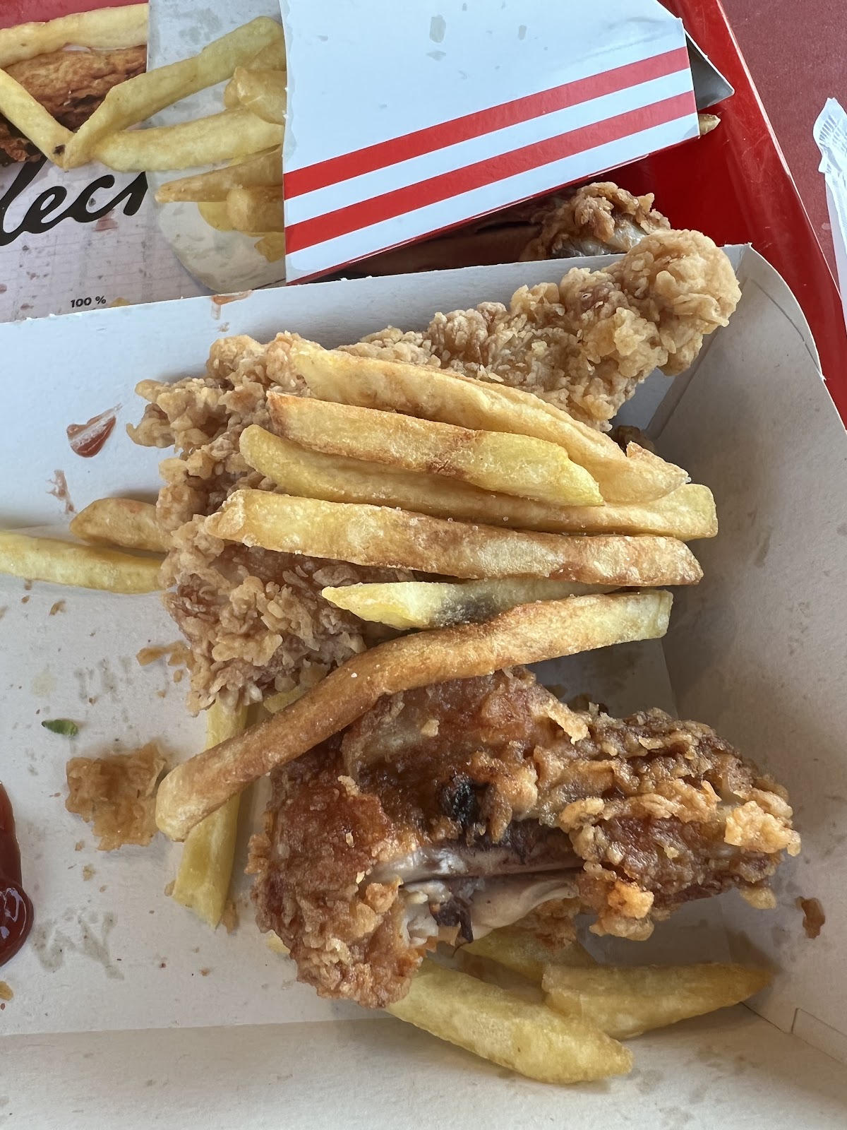 Standards of food at KFC in my opinion have gone down. For the price I paid for 4 scabby bits of chicken, and soggy chips, could have gone to local imbiß and got half a chicken and chips and still got some change. After going to KFC on and off for 35 years will not be going back again. Have give 3 stars because KFC always clean and tidy.☹????