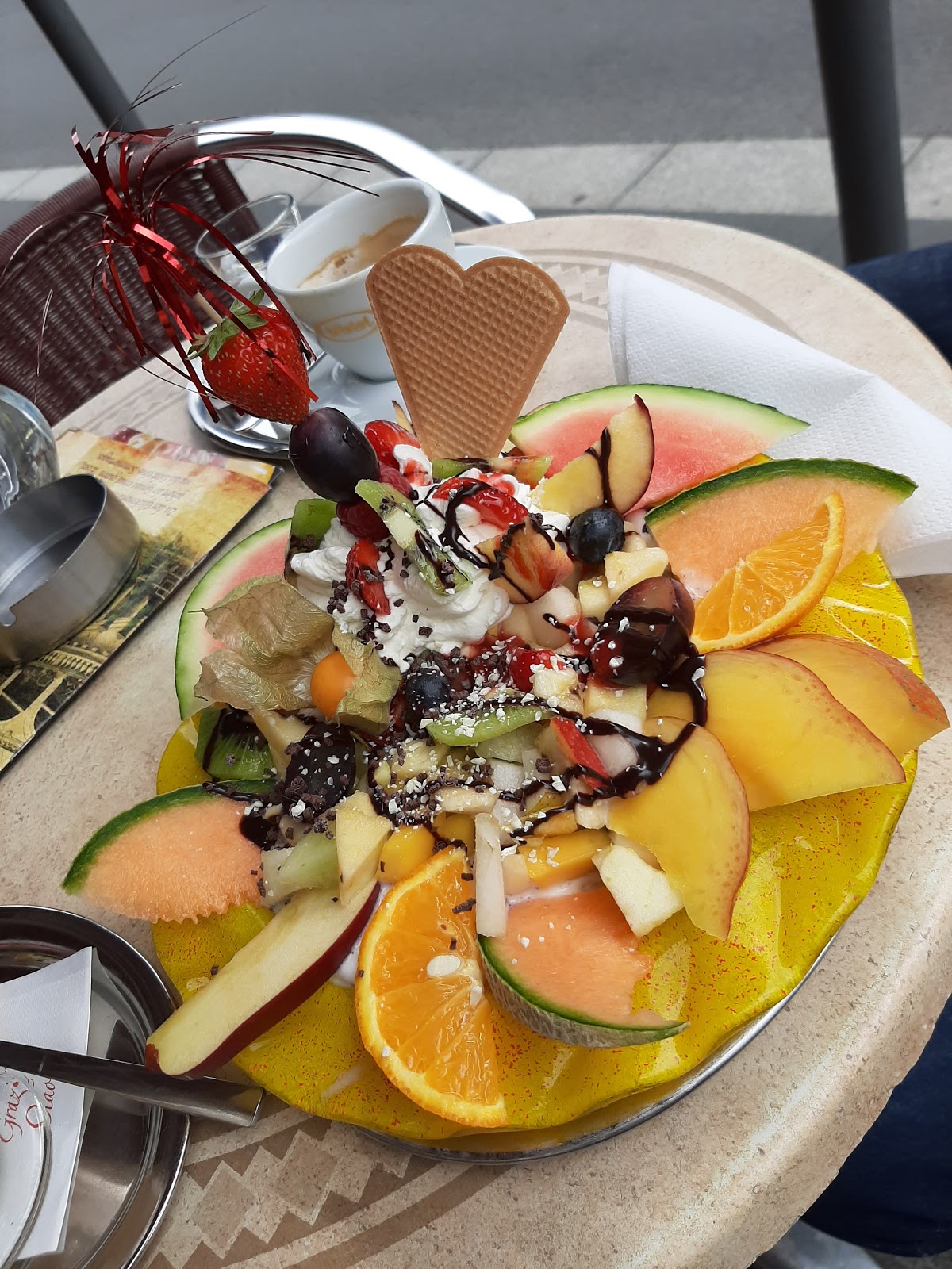 Gebracht wurden drei verschiedene Eissorten als ich die Kellnerin Frau angesprochen habe das ich eine Schoko Kugel haben wollte wurde mit mir diskutiert und sie versuchte mir noch ein zu reden das da Schoko drin ist !