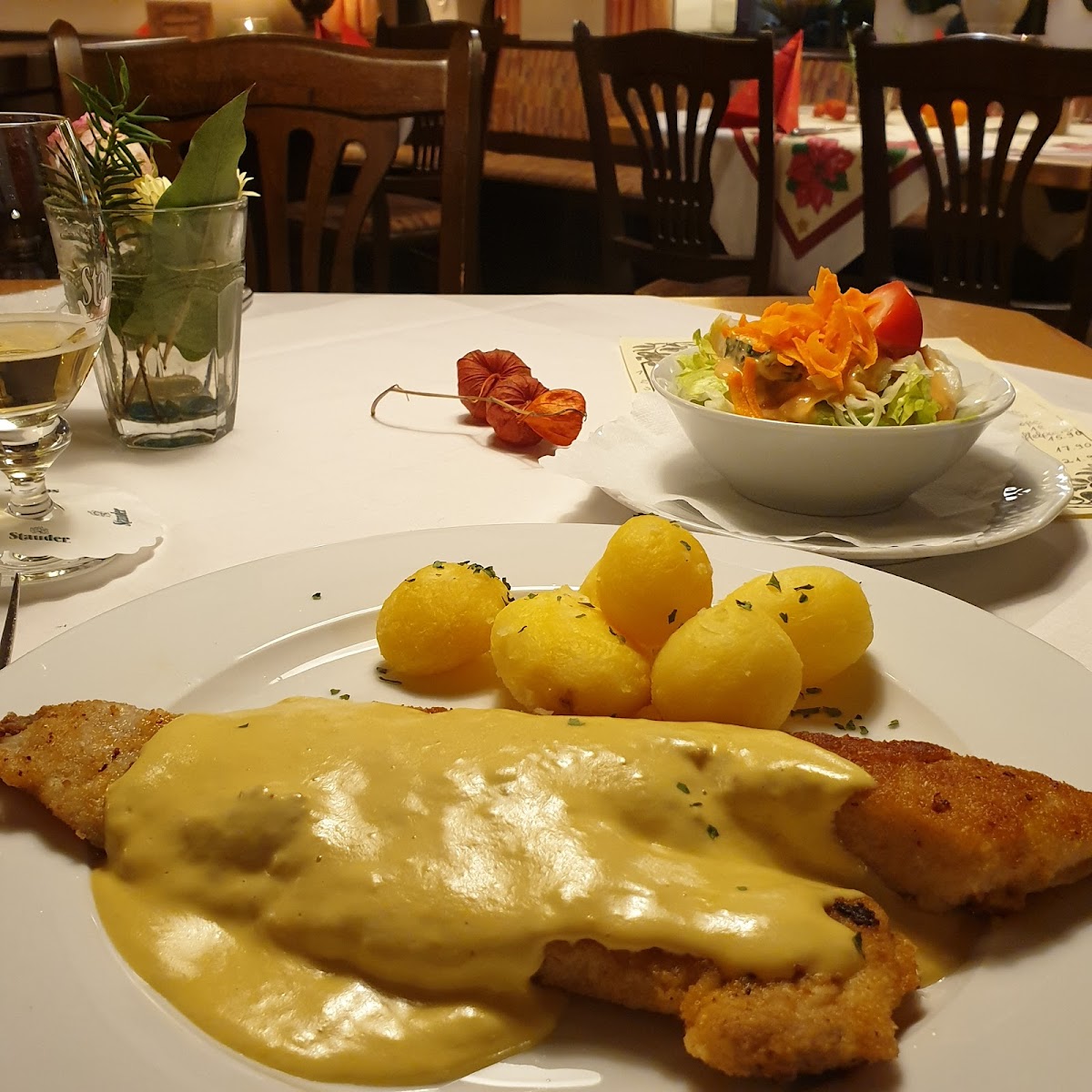 (Translated by Google) The food was really excellent! I had turkey escalope with chanterelle sauce and boiled potatoes. The food was quite a bit (yay!) but succulent and perfect. The older swing music in the background made the flair of a bourgeois inn perfect.