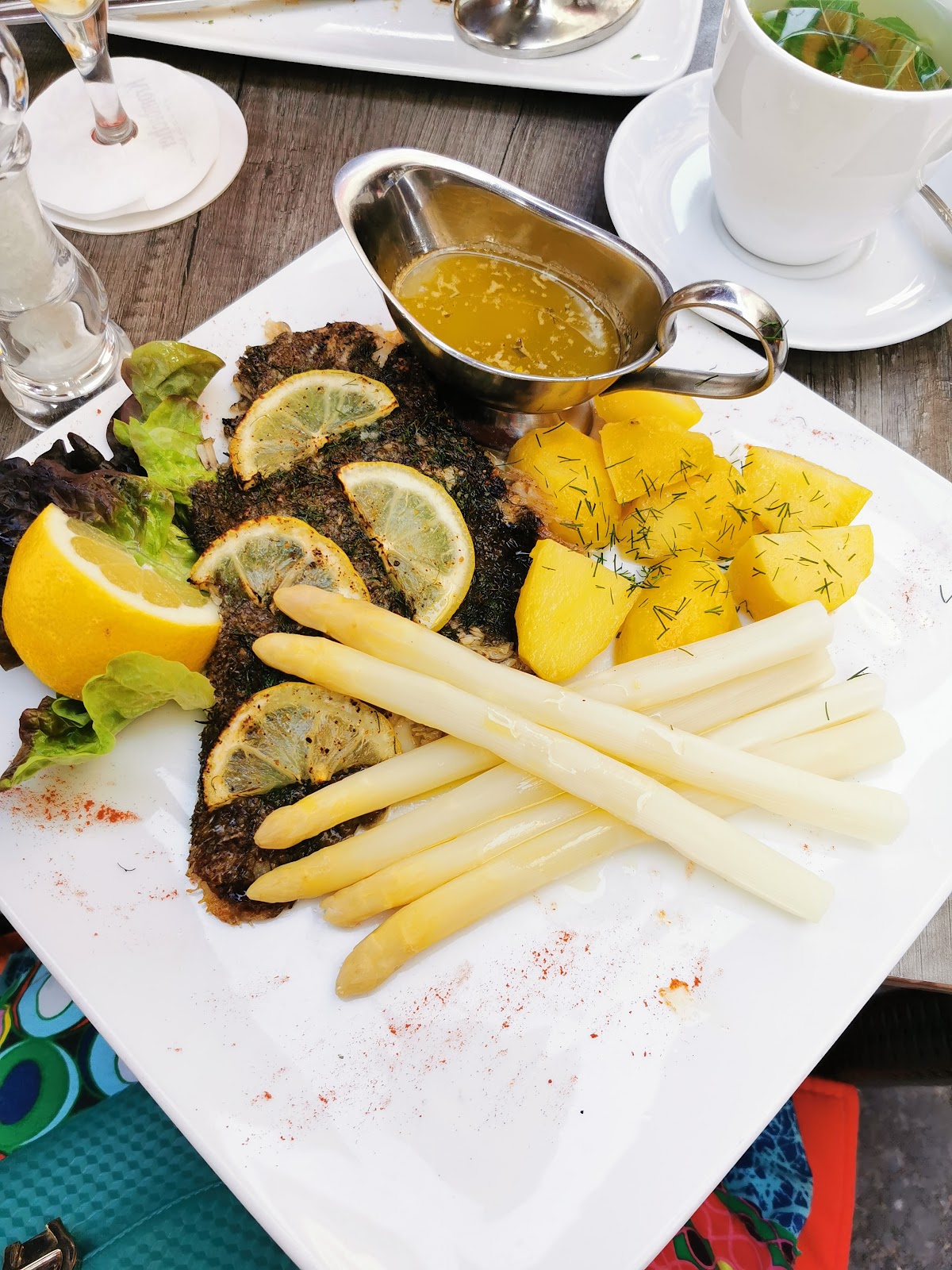 I enjoyed a glass of reisling with my seelachesfilet (pollack or coalfish) in a gravy, topped with fresh dill served with boiled potatoes. The salad was quite nice, too, with lettuce, tomatoes, carrots, cabbage, and cucumbers in a tasty, dark, vinegary dressing. The waitress was also friendly.
