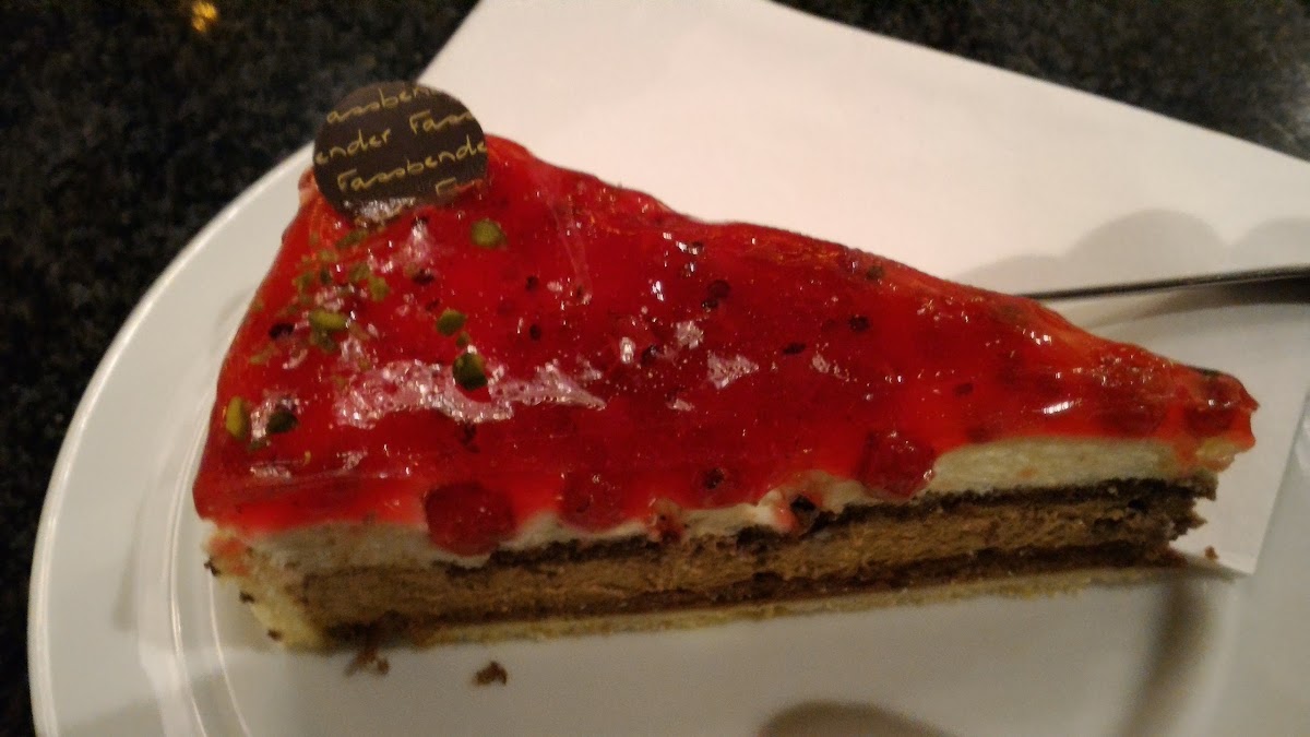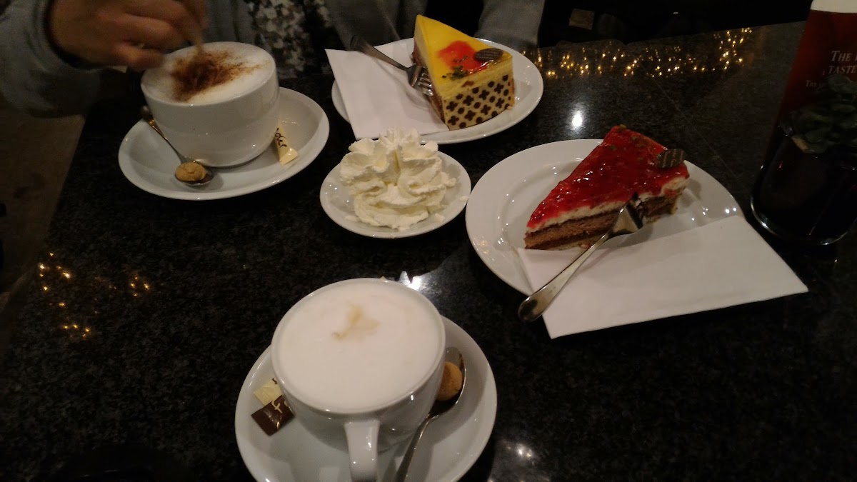 The selection is of pies, pastries, and cakes is good, and the house specials are usually very delicious. The cakes are not too sweet and fruit/cream combinations are wonderful blends of tart and potent fruit jams with e.g. chocolate whipped cream spiked with a hint of alcohol (e.g. rum, etc). The crust provides the necessary crunch to bring things together. The cappucino is delicious, and the semi-sweet hot chocolate is great.