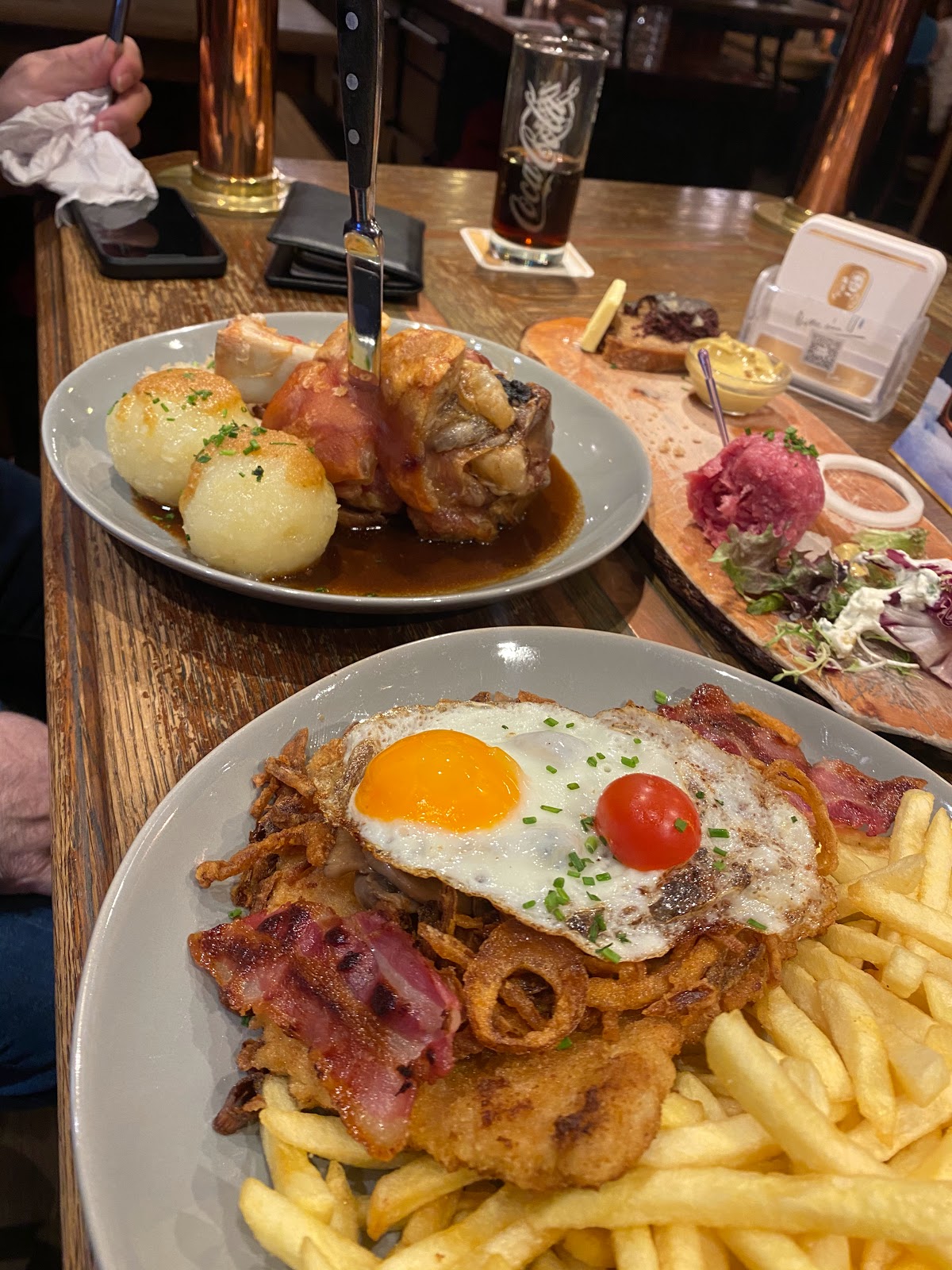 Good place to eat and have typical German food. One of their specialities is a schnitzel with mushrooms, bacon, grilled onions and eggs, as shown in the photo. A meal is around 20-25 euros per person including drinks.