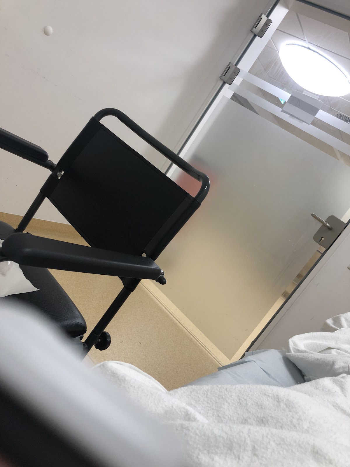 Ich kam mit extremen Schmerzen ins Krankenhaus. Ich habe Corona. Dann wurde ich mit einer FFP-2 Maske in einem isolierten Raum gebracht.