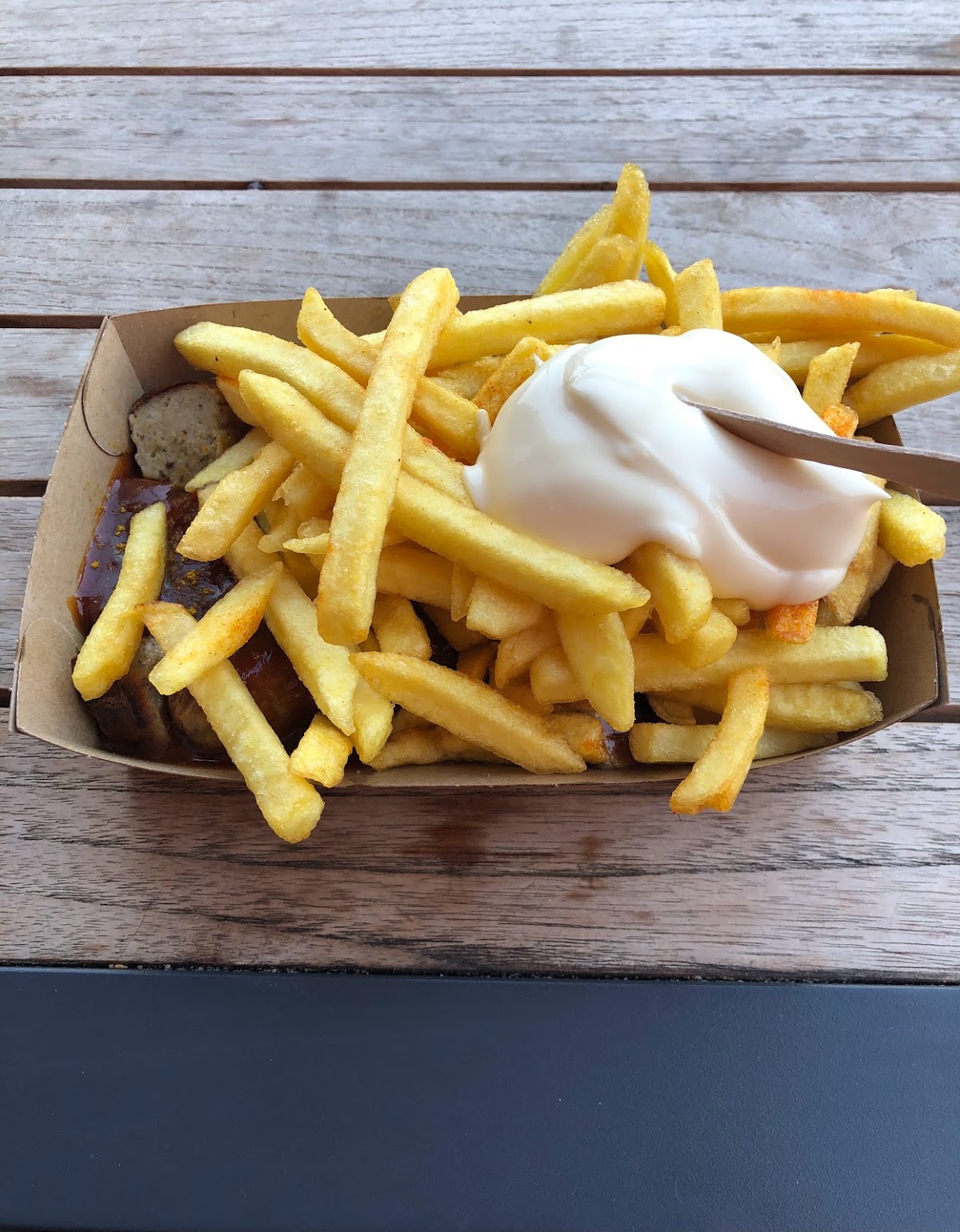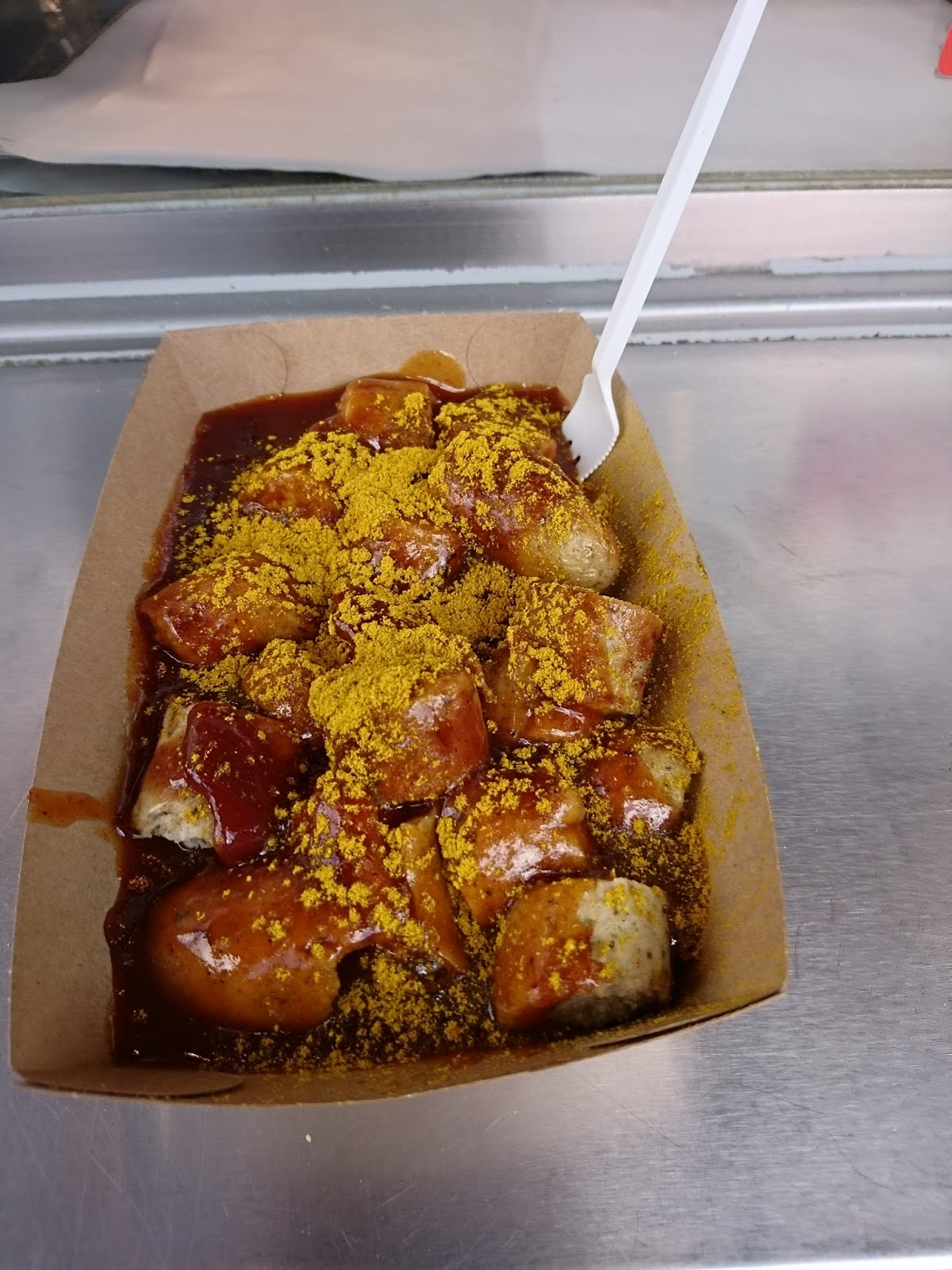 (Translated by Google) Totally disappointing today. French fries weren't done, and the skin on currywurst and curry-krakauer was very hard.