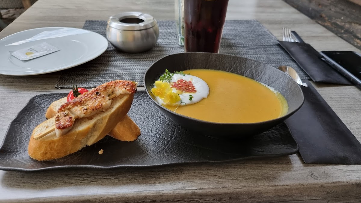 Food is excellent the German beef ribs are divine, Thai soup starter very tasty visit everytime I'm in chemnitz, washed down with a nice schwartz beer.