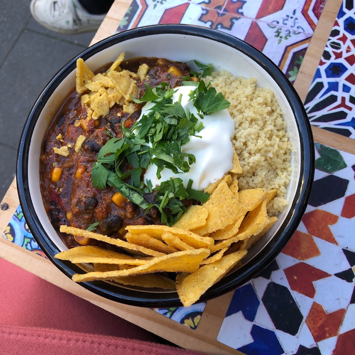 Fantastic Chili, both with meat and vegetarian. 9 € for the small portion (which is enough for me ---u003e 1.90m guy), 12 for the large portion. You can choose between 4-5 chili variations.