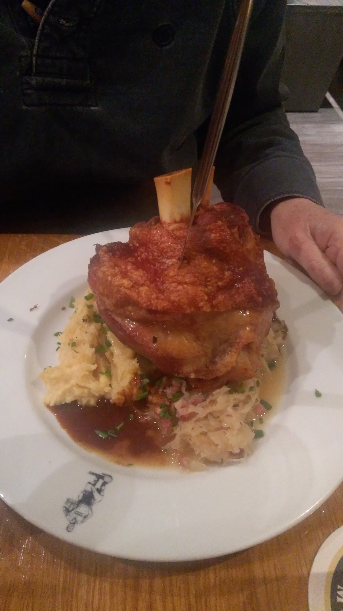 Friendly, good food, good beer, good service. We had the Himmel und Aard and the Knusprige Schweinshaxe which were both delicious. The Schweinshaxe had lovely crisp and tasty crackling; it was huge and had enough meat on it for two meals, but they let us take the remaining half away with us in a bag.