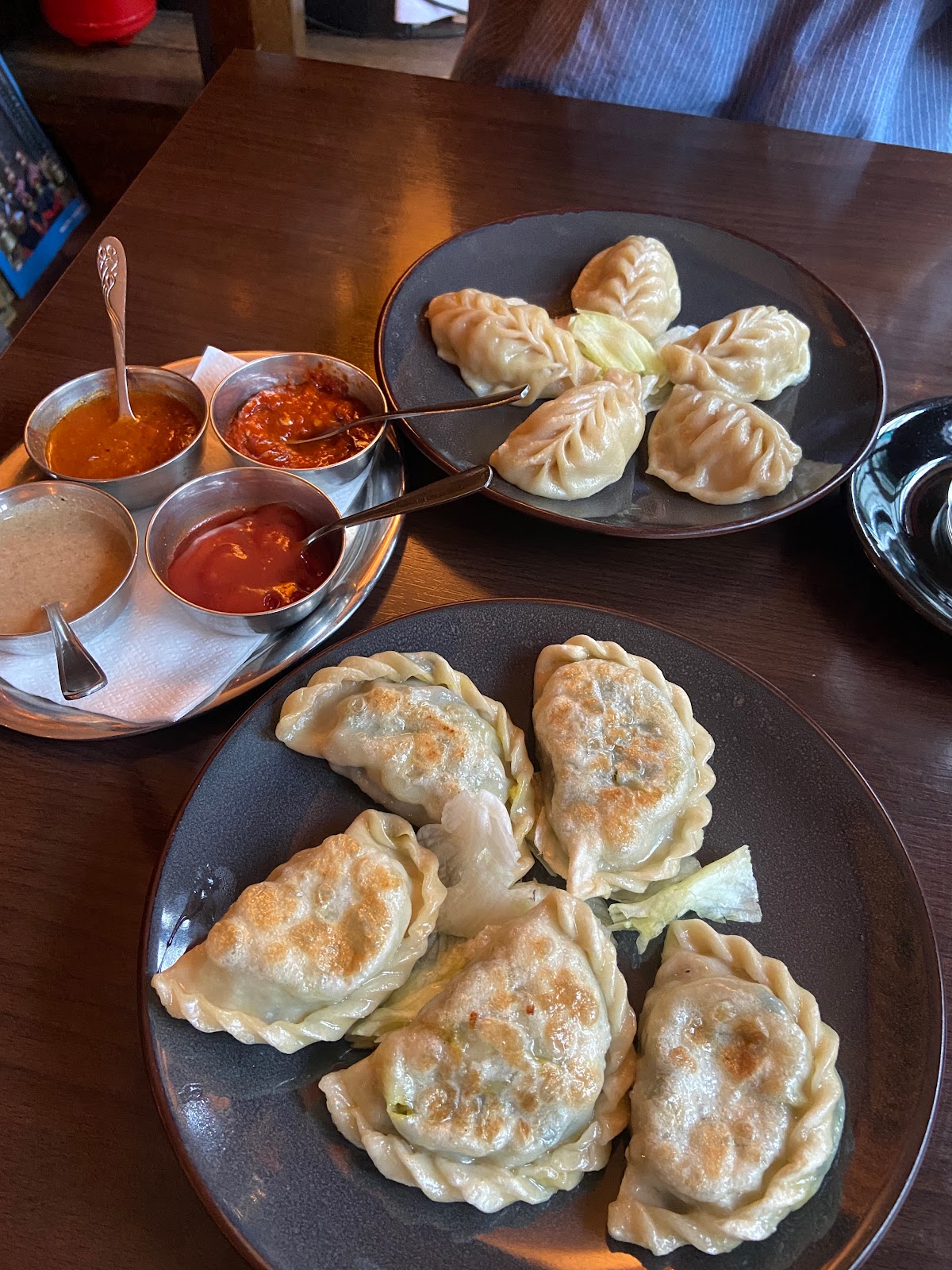 My friend and I originally wanted to order individual set menus, and instead, the friendly waitress recommended that we go for the two person Thali…I’m glad we did! We got a lot for the price including poppadoms with 4 dips, a salad, 4 main dishes with rice and a dessert included. We ordered steamed vegan Momos as well to try but the portions are large enough for two!