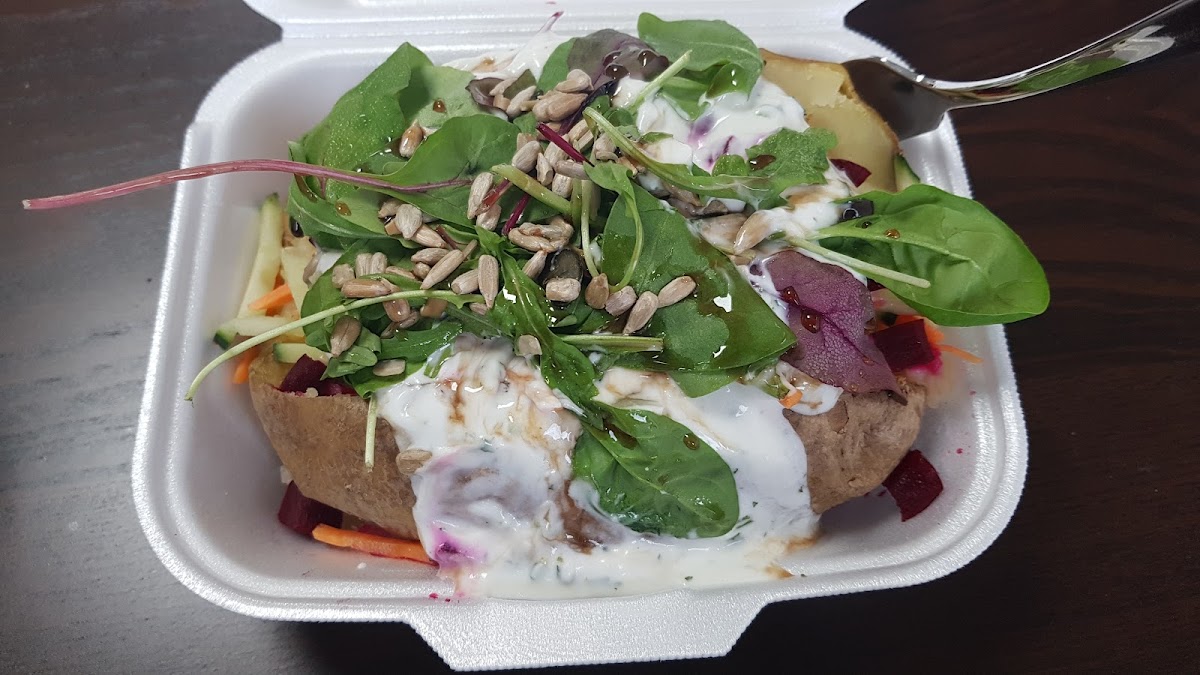 (Translated by Google) Here there are delicious stuffed baked potatoes (all from our own production) which can also be ordered vegan. For potato and fillings is not pungent and I like all variations very good. The coffee is organic from Segafredo. The juice spritzers have always had a great relationship. Great atmosphere and discreet classical music and jazz music in the background. Spend my lunch break alone or with colleagues since the opening! Value for money is more than fair, so a clear recommendation.