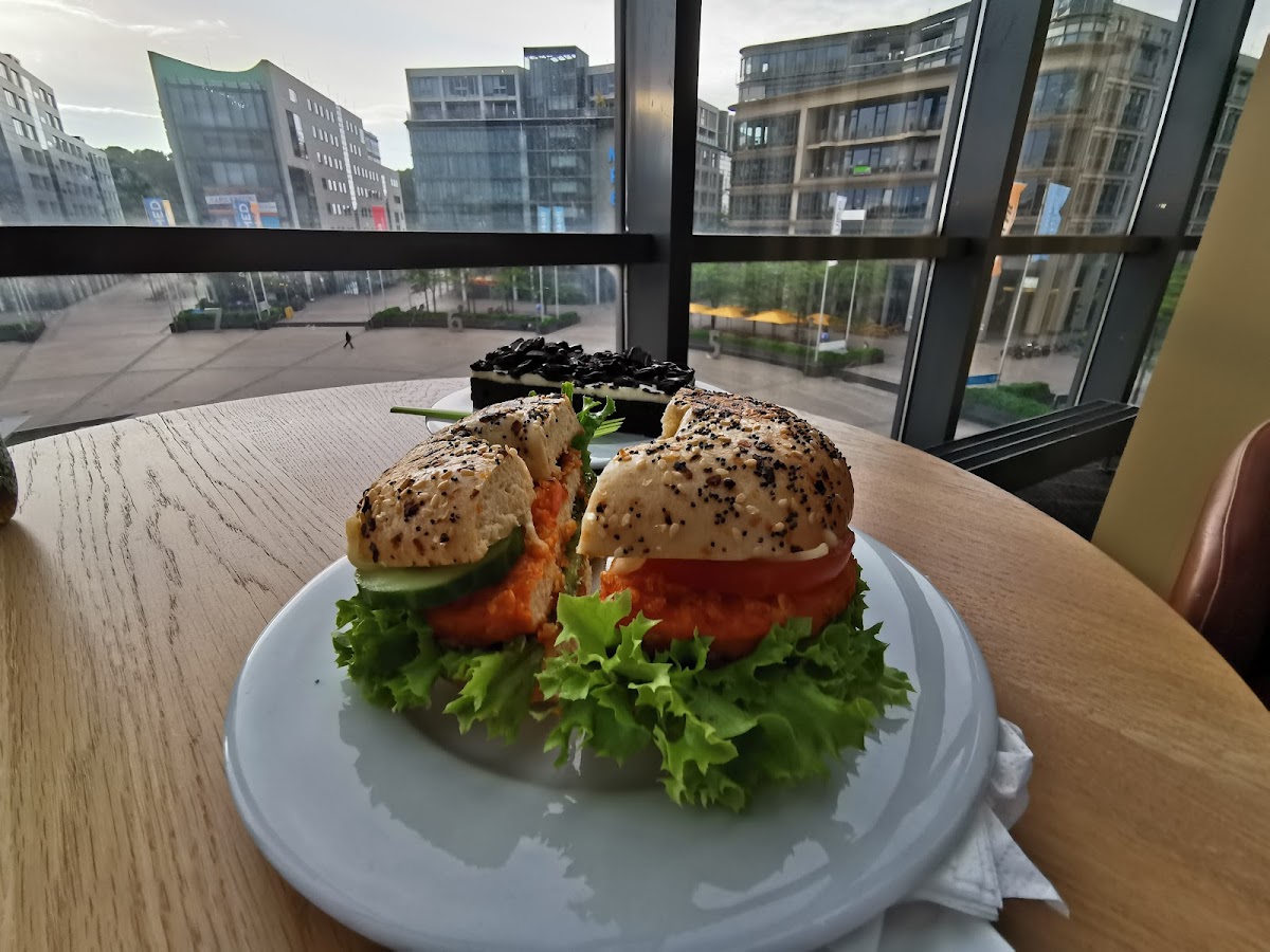 Good location, the seats at the window have a nice view onto Mediapark and the lake. They were sadly out of Bagels but the sandwich was tasty. There’s a very fast wifi connection. Card/phone payment was possible.
