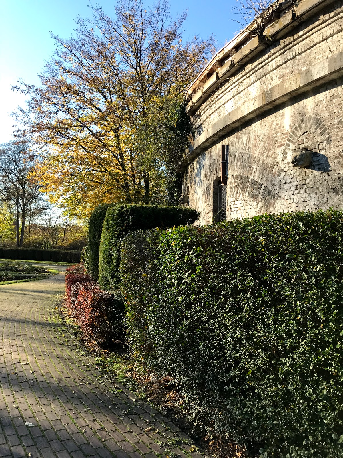 Ein rundes Gebäude das von Bäumen zimlich verdeckt ist. Vom Rosengarten kann man das Gebäude und den Turm gut anschauen. Der Rosengarten selber sieht wie frisch angelegt. Alles nur kleine Sträucher. Am anderen Fort ist der Rosengarten viel üppiger. In das Gebäude selber kann man nicht rein, da es vermietet wird. Macht auch kaum sinn, da alles militärische entfern wurde. Die Stadt Köln verfolgt bein den Fortresten scheinbar die Politik verstecken und vergessen. Nirgendwo ein Schild direkt am Gebäude, nur im Garten selber gibt es eine beschmierte Tafel zu der Parkanlage.