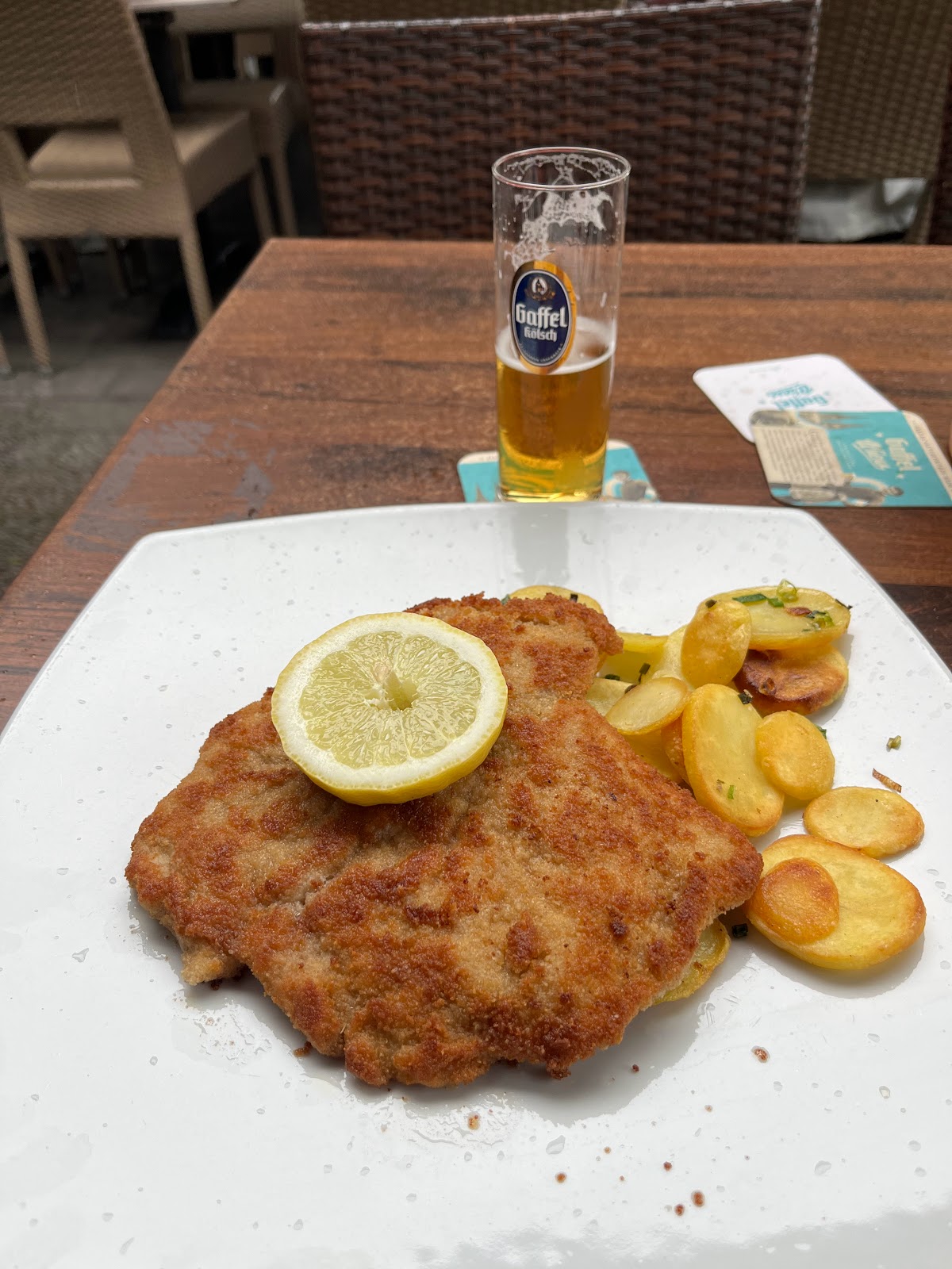Food is very good - you can taste a little bit of German cuisine. Staff is also nice and try to get your order on a good amount of time, however, it was raining a lot (literally on our food!!!!) and they appeared not to be very happy as we asked to eat inside because the small tent was not working (and it won’t if they keep putting the tables in the between two tents with a space) - it was a little bit strange.